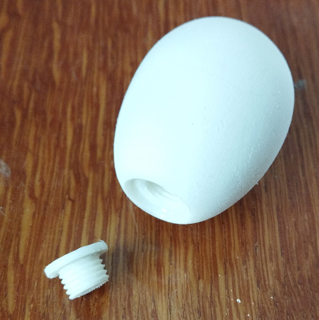 С яйцом пришлось помучиться, ибо не удалось распечатать без поддержек, которые весьма круто загадили изделие. Пришлось из 2 неудачных склеить одно нормальное и вклеить резьбовые вкладыши, с резьбой нарезанной плашкой и метчиком М12х1,5. Вроде неплохо получилось....