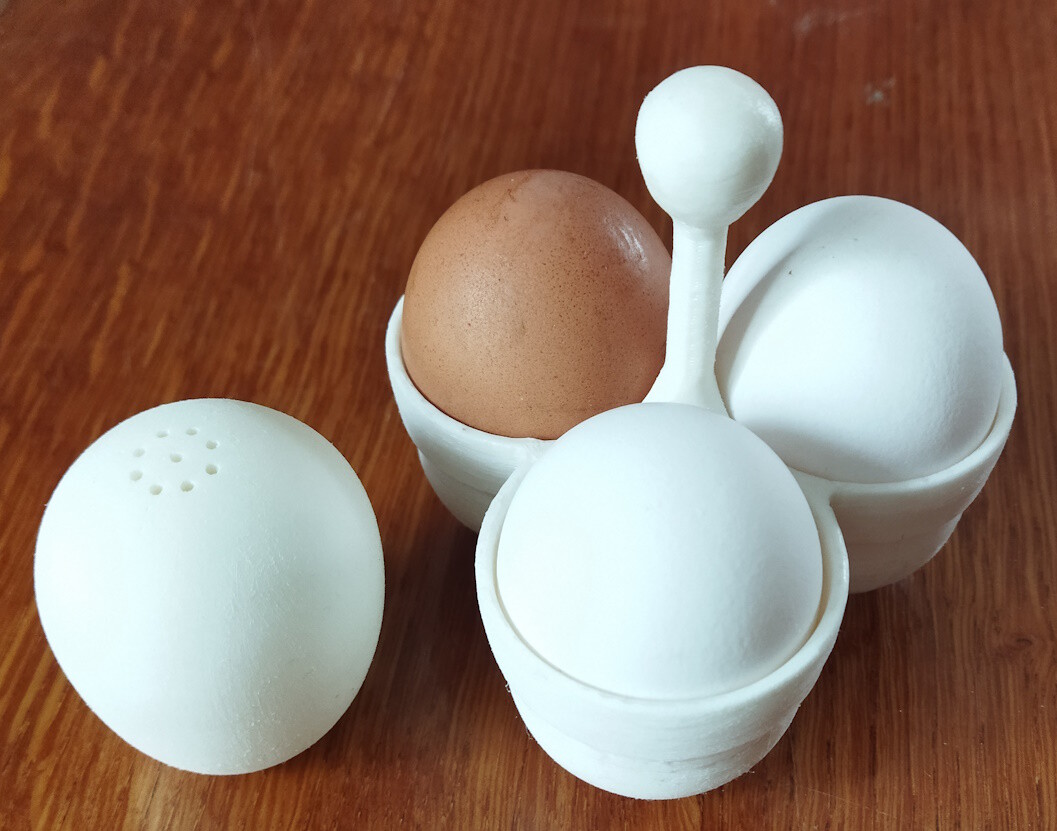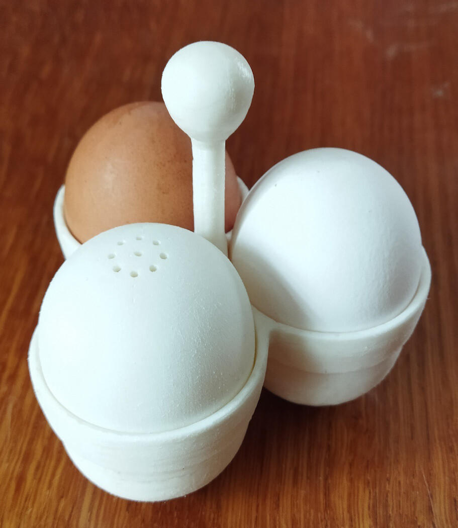 Чертить яйцо в ДСМ тоже непросто, пришлось поизвращаться, а потом своими "корявками" доводить до совершенства. Может у вас, в любимых прогах есть спец "верстаки" для рисования яиц? Сейчас продумываю для печати приборчик, для вскрытия готовых яиц. Дома есть такой китайский, делает круглое ровное отверстие, как раз для чайной ложки. Вот и всё, вроде все рассказал, можно критиковать.... STLки тут: подставка с солонкой
