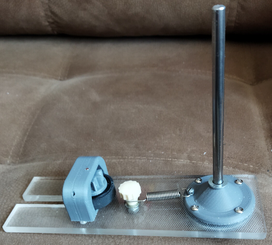 Основа для всего пластина 8мм акрила, вырезанного на этом же станке. Есть пружина для гарантированного прижима фрикционной пары, один конец которой цепляется к барашку крепления приставки к станку, а второй цепляется к основе.