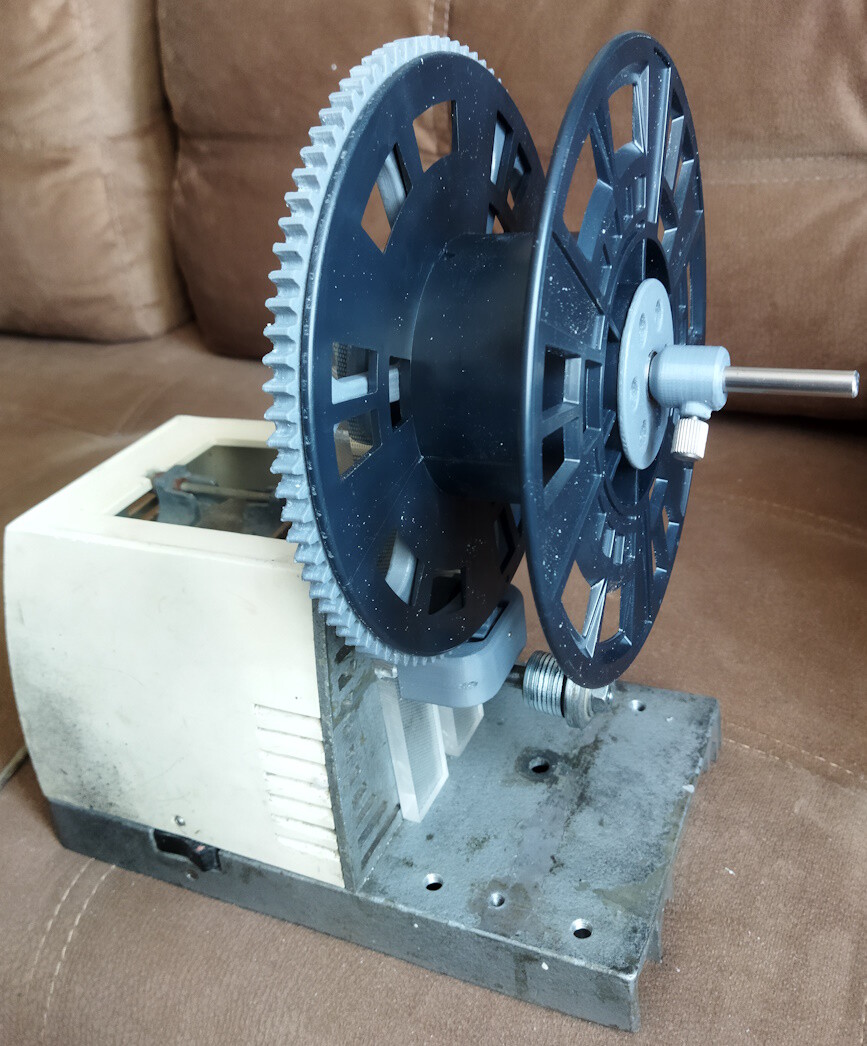 Итак, катушка с леской есть, но её надо перемотать на обычную катушку, ибо родная не очень желает влезать на предназначенные для этого держатели. Если честно, то у меня лезет во все сушилки, для линейной надо только ось сделать, но мы же не ищем лёгких путей, поэтому начал напрягать извилину. Целью было создание перемотчика, который не занимает место, ибо нужен чрезвычайно редко, а я не занимаюсь промышленной печатью с выгодным пластиком, а для себя, любимого, могу и отжалеть деняк на приличный, проверенный пруток. В закромах сайта нашел 2 перемотчика. Один сложный как пол принтера, с укладчиком, другой- обычная "мясорубка", и, не помню где, видел подающую ось с магнитным тормозом (токи Фуко). Все это вполне объемные дивайсины, требующие достаточно места, а оно, как обычно, в дефиците. Тут на глаза попался замечательный "прецизионный с ЧПУ" почти полвека работающий станок "Умелые руки",
