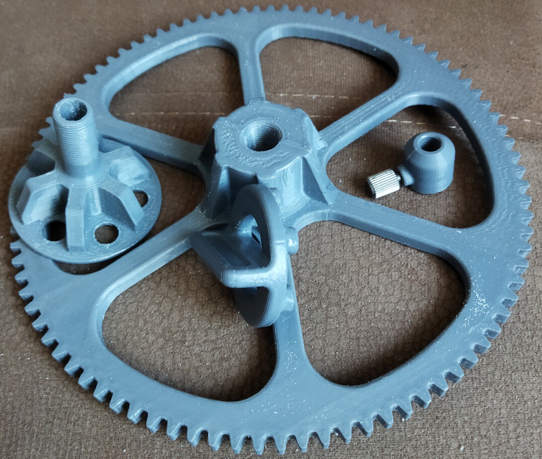 кстати, до сих пор существующий в продаже и обросший целой кучей доработок и усовершенствований. Ну и решил я его "нахлобучить" еще одной функцией. Мощи в 300вт больше, чем достаточно, крепится к столу струбцинкой, ну что еще надо для счастья? Накаряпал и распечатал зубчатое колесо на 90 зубов, к нему в пару на 8 зубов с переходником для фрикционного колеса, которое и снимает мощность с оси станка (9мм).