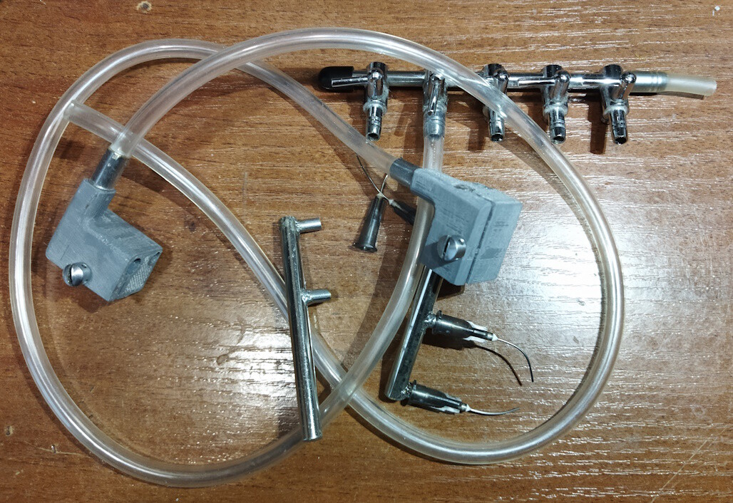 Еще пришлось добавить отдельный блочёк питания 5В для мотора сервы,( взял на Озоне сетевую платку на 3А за копейки), ибо жрет она 1,5А , а если взять с принтера 12В и сделать 5В КРЕНкой, то ничто не желает почему то работать. А вот когда мотор питается отдельно, а на управление сервы подать нормальный ШИМ, то все работает великолепно :-) Кстати, сделал еще включение компрессора от ШИМа принтера, чтоб при отсутствии команды на кулер обдува, зря не шумел, но в связи с тем, что мощный компрессор применять не стал ибо хватило и обычного 5 ватника, вести трассу к симисторной розетке не стал, и так работает все бесшумно. Из шумов только слышно сработки сервы, не часто... С выхода регулятора воздух подается на гребенку с краниками (тоже можно регулировать), а с неё уже на головку. Трубки на которой взяты от телескопической антенны, там их куча с разницей в 1мм. Я использовал 6, 5 и 4 мм. Очень легко паяются и режутся, латунь... Шланжик от автомобильной трассы омывателя, 4мм внутренний диаметр, очень гибкий и весьма долговечный.