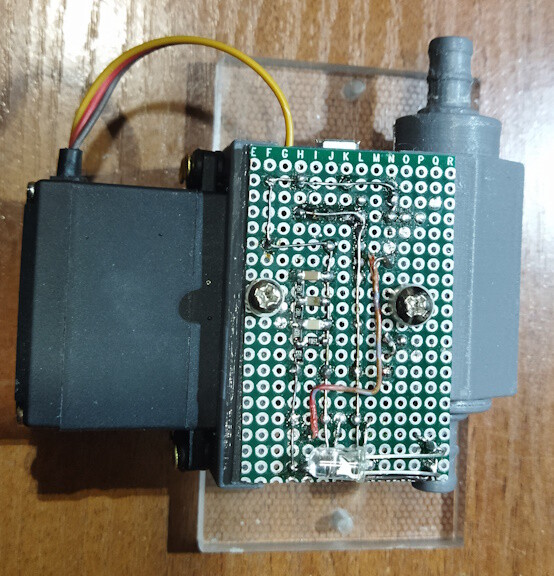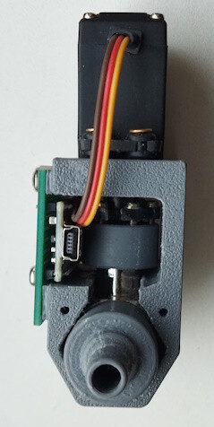Все хорошо состыковалось и даже не стал закреплять серву в основе, и так сойдет ;-)... С управлением сервой пришлось повозиться, ибо с появлением осциллографа стало ясно, что на халяву управлять сервой от принтера напрямую на получится ибо принтер выдает ШИМ на кулер, мало того, что 11в амплитудой и еще с частотой обновления 492 герца, а серве надо 50 Гц, ибо её контроллер не успевает обрабатывать скважность :-(. Пришлось "душить" ШИМ фильтром с делителем и полученное напряжение переменной амплитуды подавать на аналоговый вход ардуины и уже полученный "правильный" ШИМ подавать на серву. Сделал на "макетке", ибо лень печатую плату делать...