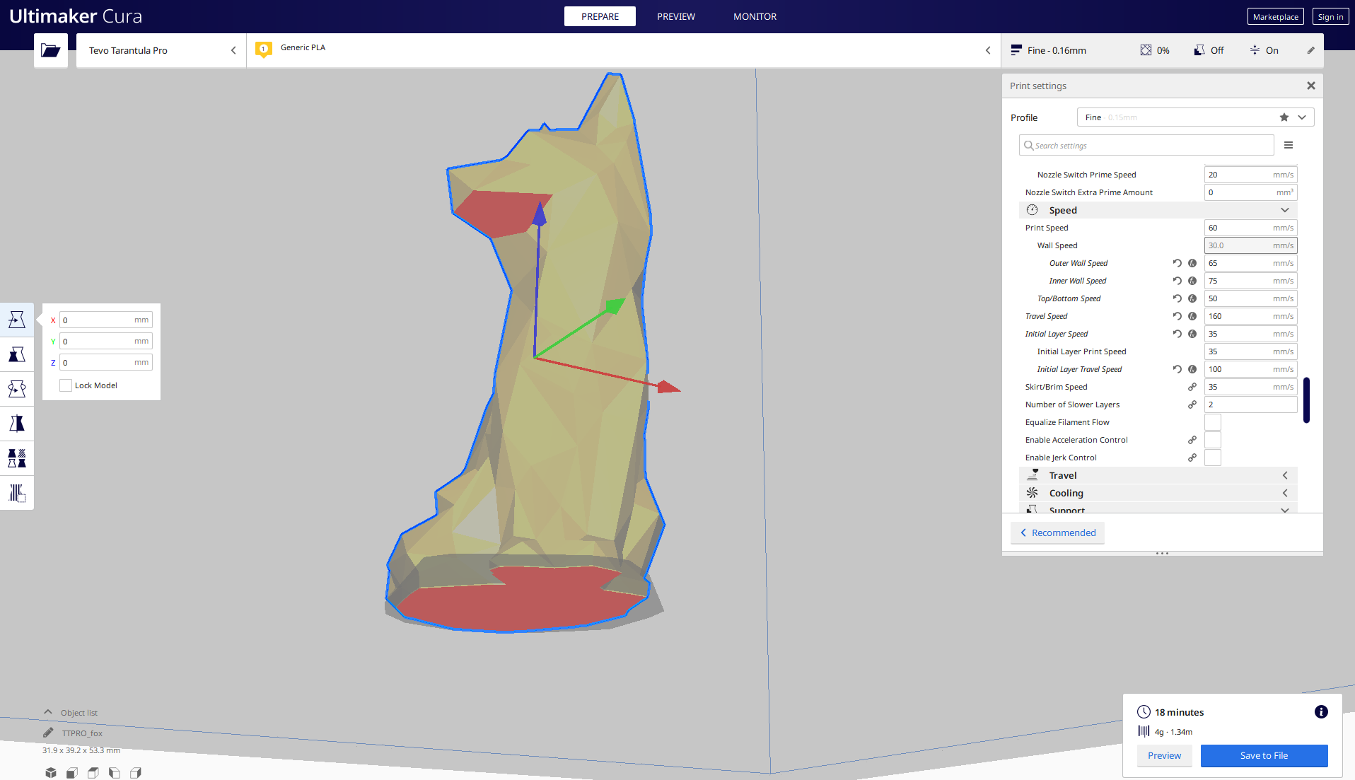 2 слоя, печать без поддержек хоть и подбородок красный, время слоя 0, внешний 65, внутренний 75. Размеры 50% от изначальной модели. Скорость тут не особо важна, будем играться с ускорениями и джерками.