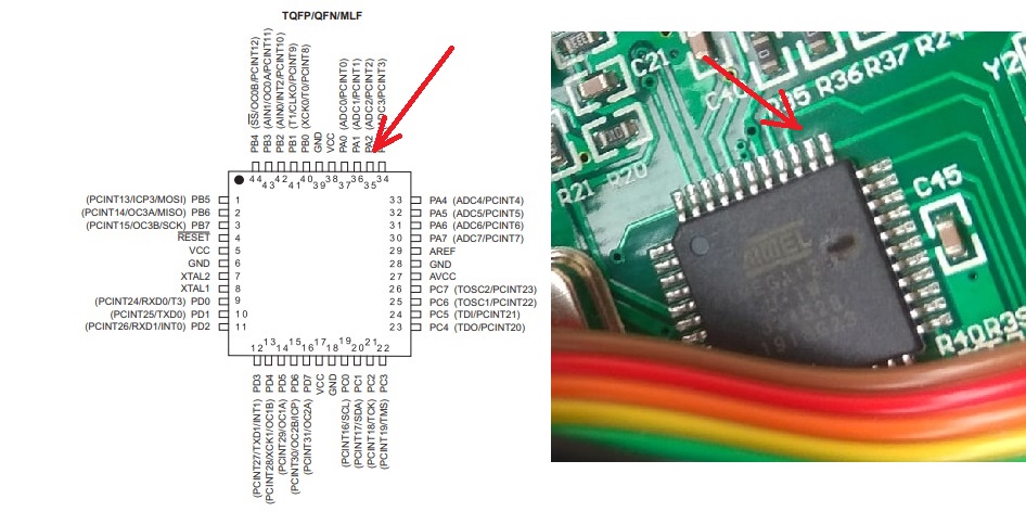 Далее смотрим Datashit на контроллер, смотрим какая физицески нога относится в порту А2: