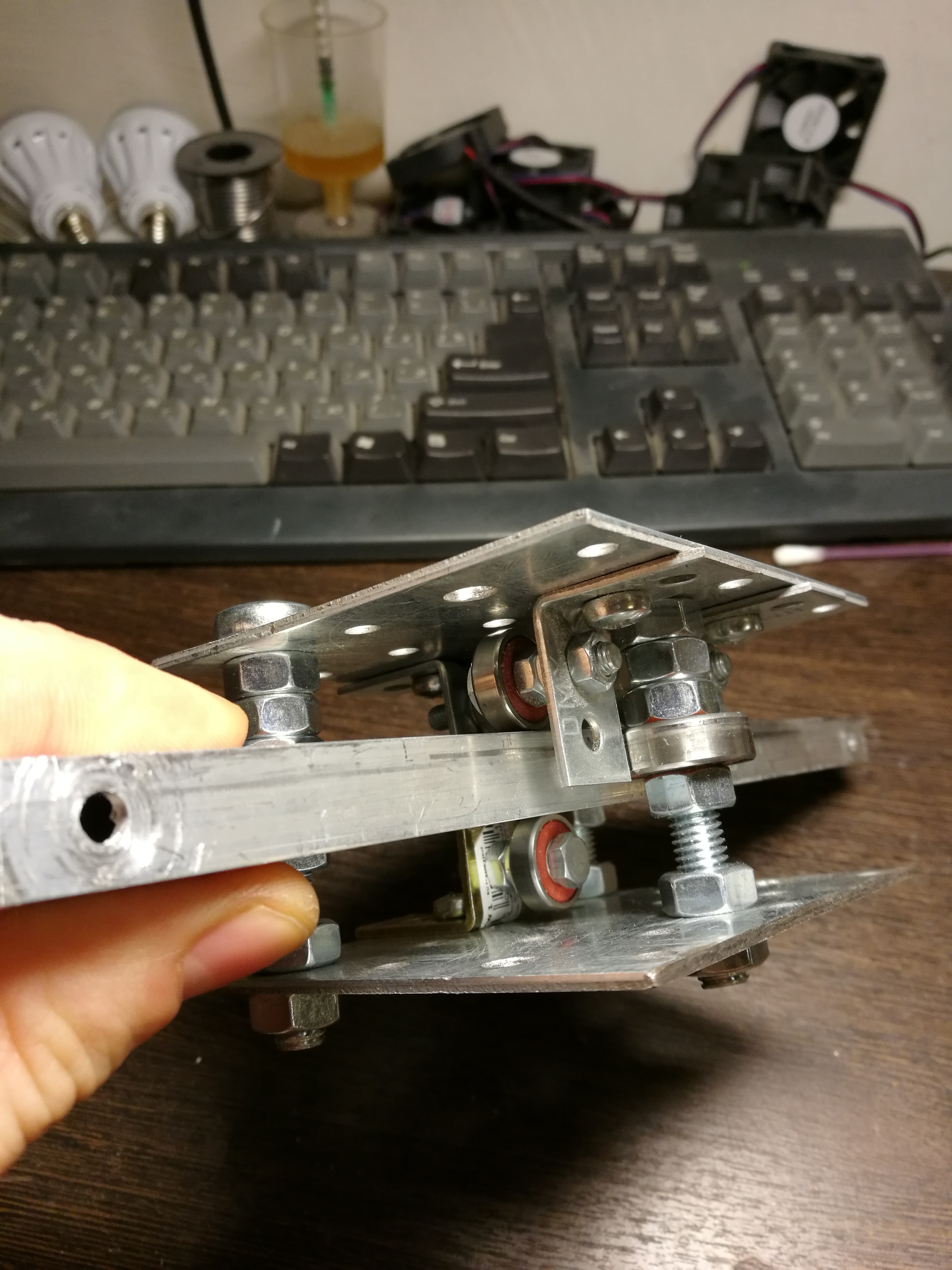 После сборки и обкатки стола принялся за ось Z. Технология примерно такая же, только сделал стационарную каретку и двигающеюся направляющую из одного профиля. По фото видно.Стойка крепления оси Z получилась хлипкой, нижнее крепление нормально(там где зажата между двух профилей) а вот верхнее легко сбивалось. В итоге сделал рычаг и добавил шпильку между этим рычагом и столом. Теперь легко регулировать перпендикулярность оси столу и ничего не сбивается.