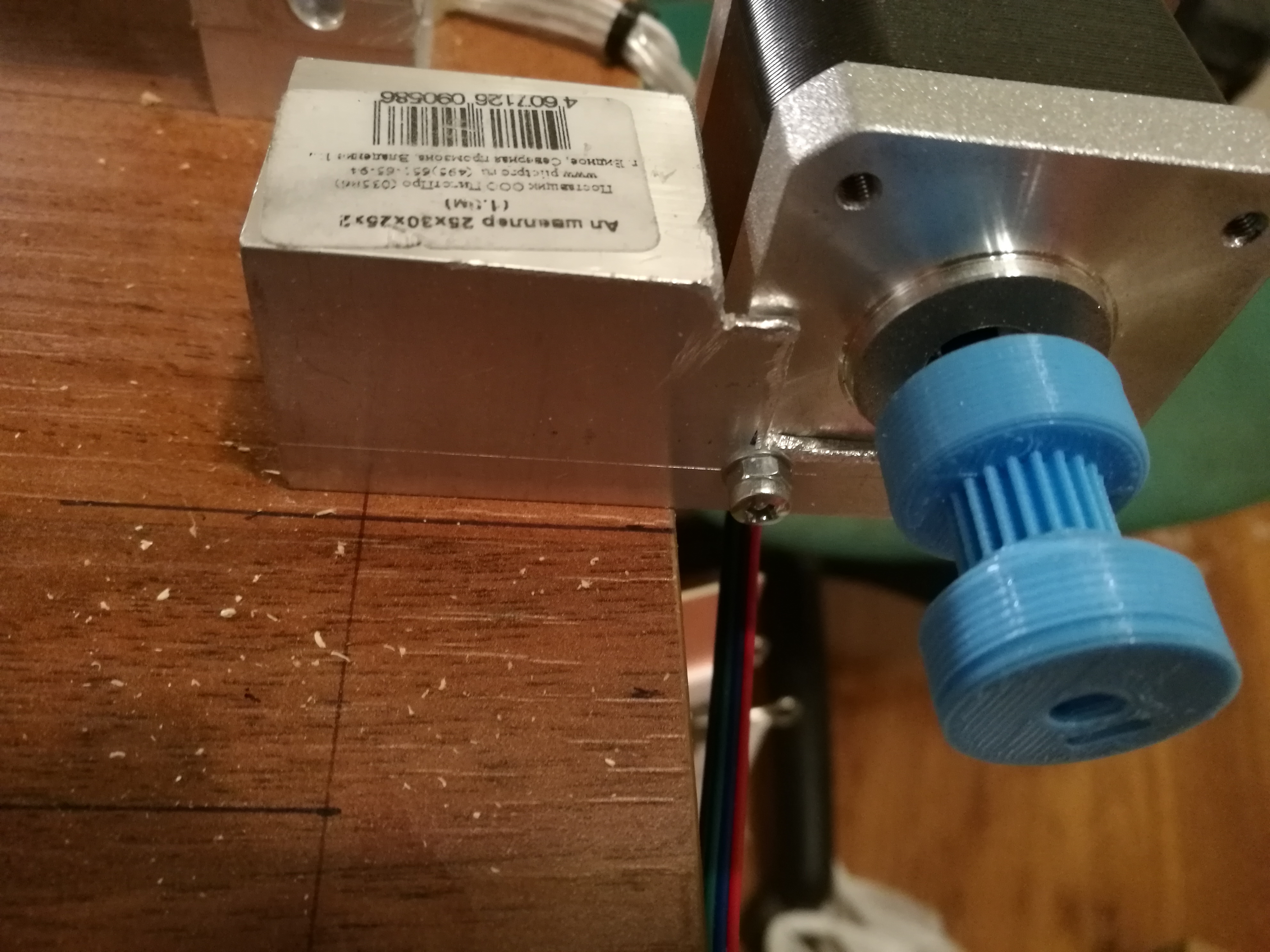 Привод стола делал на шпильке м5 с шагом 0.8 мм (это как оказалось - большая ошибка, из тех шаговиков что у меня были и тех что покупал максимальная скорость была у шаговика из сканера - 10 об/сек т.е. максимальная скорость перемещения стола 8 мм/сек а у остальных еще меньше 6 мм/сек). Шпильки с валом двигателя соединял 3-мя слоями термоусадки + поверх нее хомуты. При длине термоусадки 6см держит бетонно и при этом мягкая и нивелирует биения шпильки. Гайка на эпоксидном клее крепилась к уголку а уголок уже к столу.