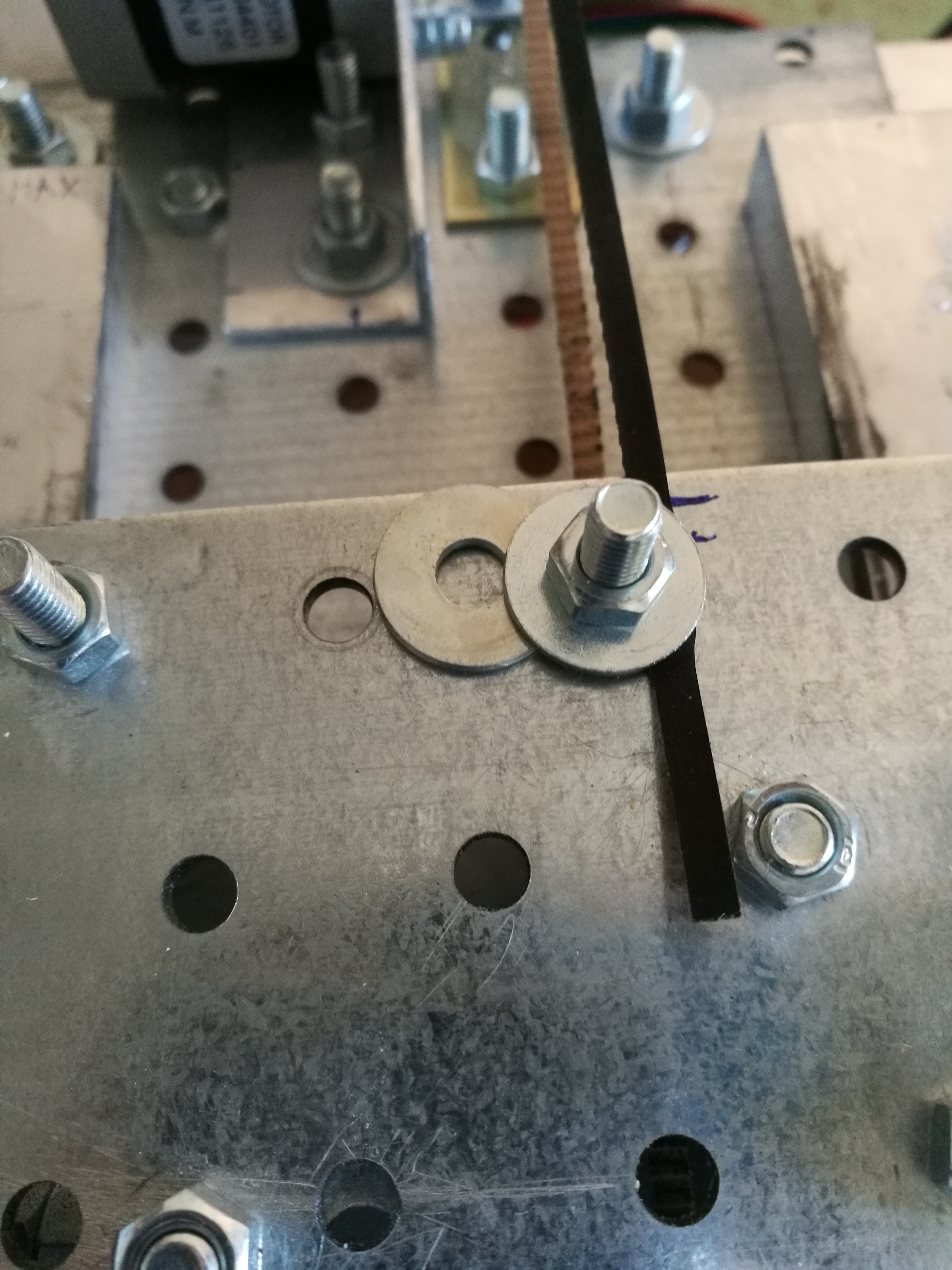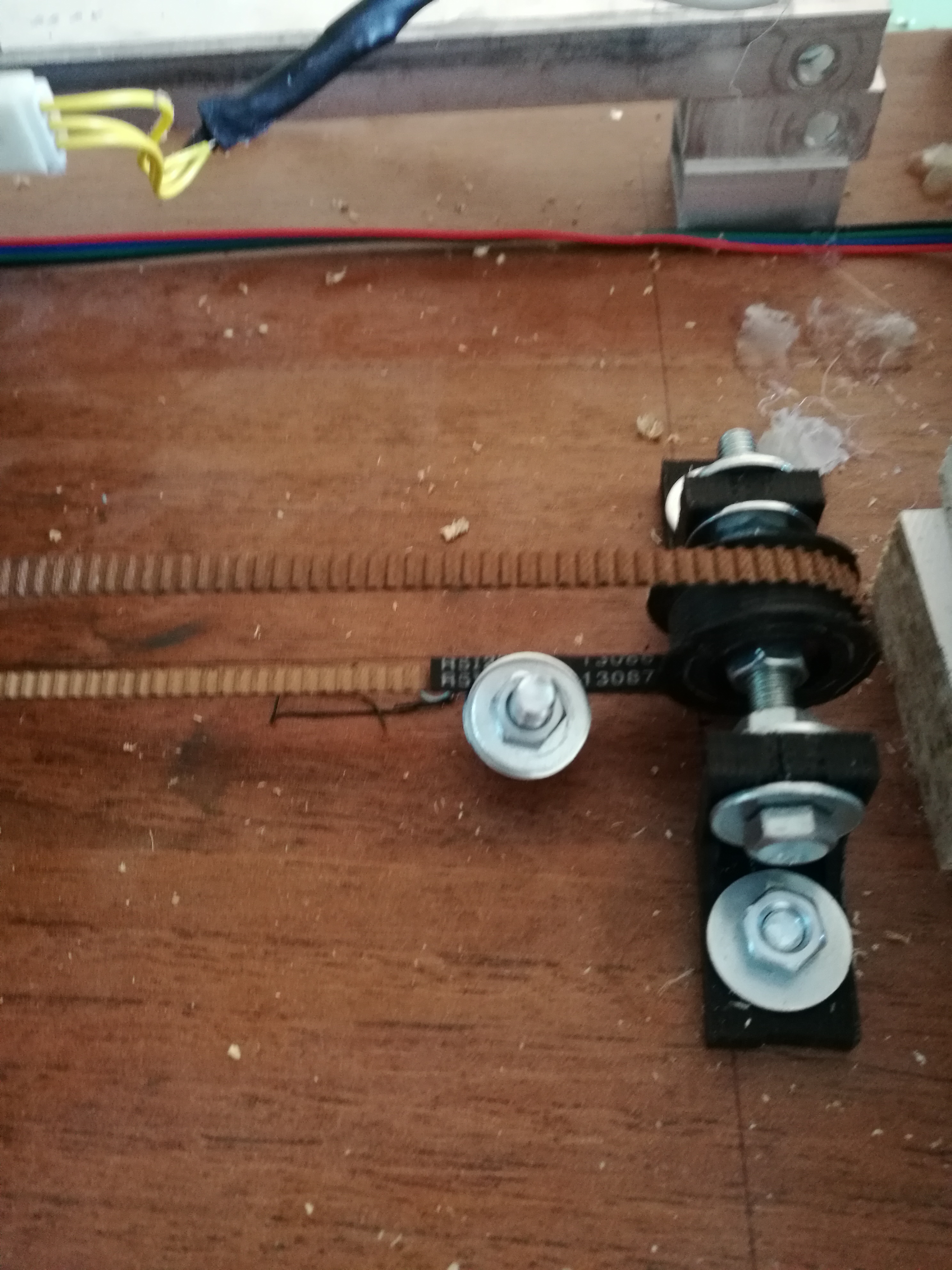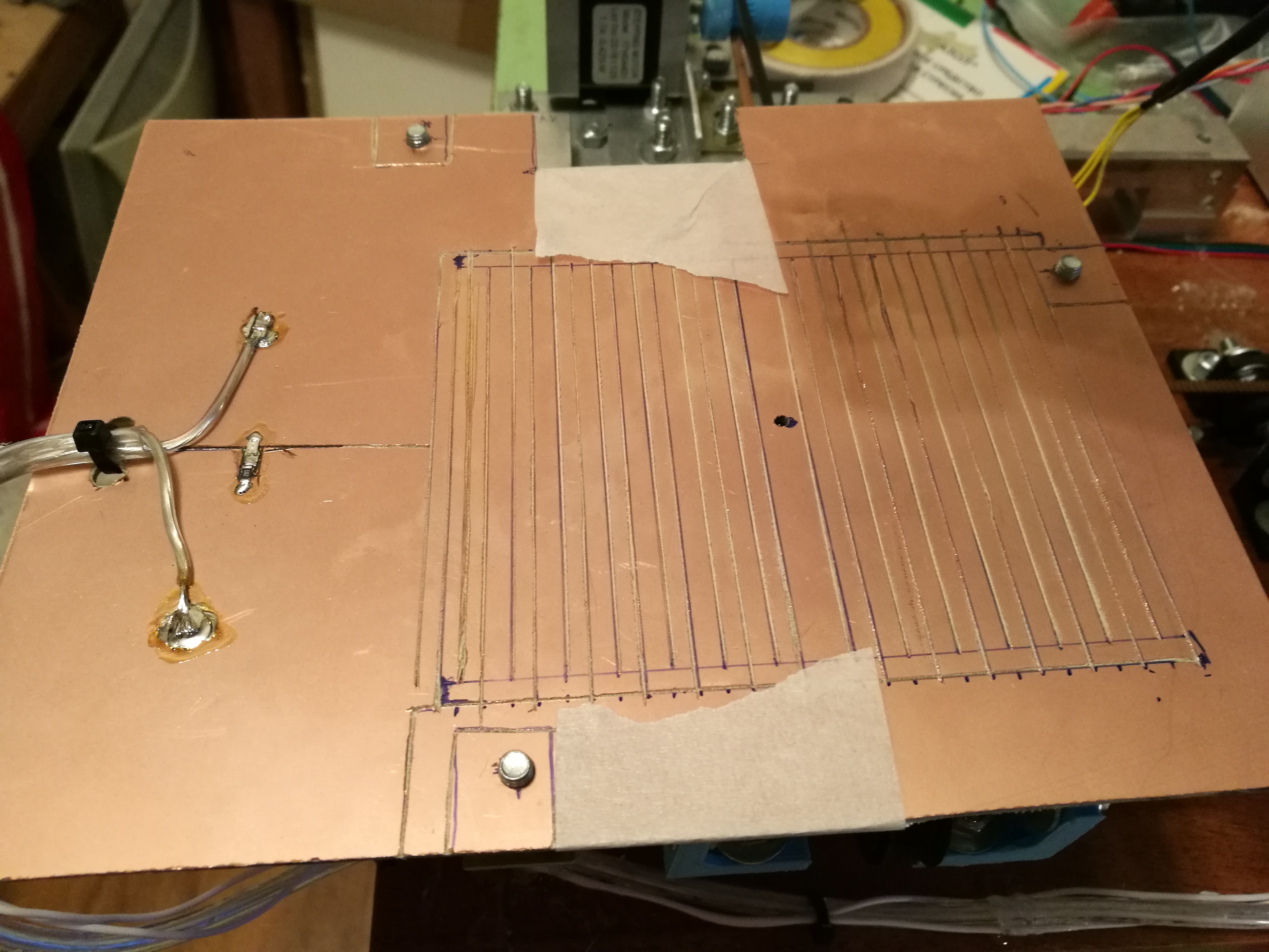 Взял кусок текстолита, насверлил дыр под крепление. Наметил область которую надо греть. Прикинул что если стандартный МК2 20*20 150 Ватт, то мне для стола 10*10 хватит 50 ватт за глаза, в итоге нарезал дорожек 2мм толщиной по всей площади, при 12в ток был чуть выше 3 ампер итого 40 ватт. В итоге максимальная температура 104 градуса, чтоб догреть до 90 приходилось ждать минут 15-20.... Кошмар. Плюс дорожки нарезал как попало и где они тоньше там греет сильнее.Испечатал значит я все свои 30м заказанного PLA. и такая скорость меня достала. Решил переделать на ременный привод, ну и плюсом стол переделать. Заказал ремни, шпули и подшипники. А в китае новый год.... две недели на обработку заказа :(