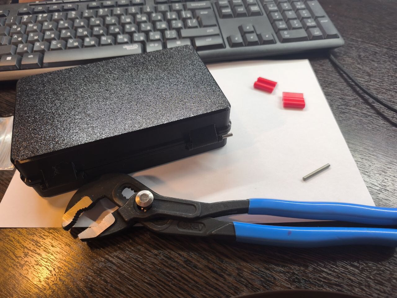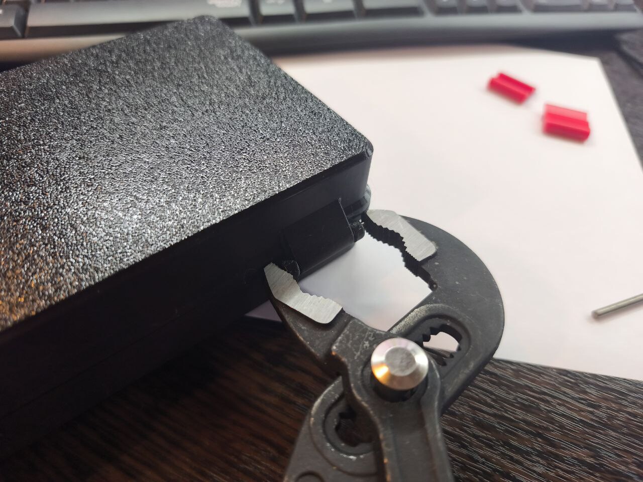 Дальнейшая практика показала, что штифт выглядит всё-таки более презентабельно. Но есть проблема с его имплантацией в отведенное место. Если винт можно худо-бедно вкрутить отверткой (разработчики, походу, такой вариант учли и сделали часть одного из отверстий несколько меньше и винт сам себе в пластике резьбу нарезал бы), то методика помещения штифта на заданное для него место оставалась пока не определенной. Забить - есть ненулевая вероятность повредить петли с дальнейшей перепечаткой поврежденной запчасти, просто чем-то с одной стороны надавить - аналогично молотку, можно повредить одну из петель. Получается нужно что-то, что могло одновременно с одной стороны вдавливать, а с другой поддерживать штифт. На мой взгляд для этого могли бы подойти маленькая винтовая струбцина, что-то типа ювелирных металлических тисков, какие-нибудь пассатижи. На последнем варианте я и остановился. Проблема в том, что пассатижи, которые могут раскрываться более чем на 30 мм - это уже довольно большой инструмент, и, когда работаешь с мелочевкой, не совсем нужный в хозяйстве. К счастью у меня в загашнике случайно завалялись переставные пассатижи, которые с честью помогли выполнить квест.
