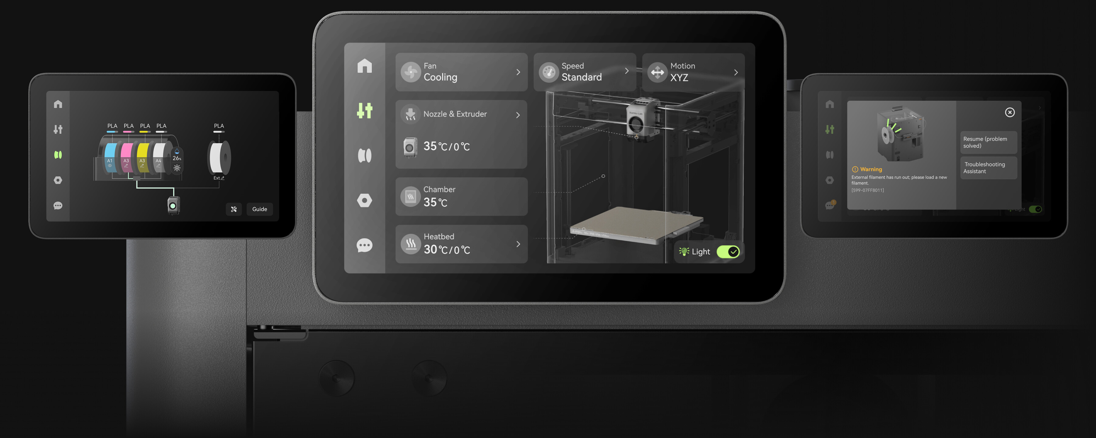 Принтер получил новый 5-дюймовый сенсорный экран с современным интерфейсом и быстрым откликом. Управление доступно через Wi-Fi, LAN или облачный сервис, а также через фирменные приложения Bambu Studio и Bambu Handy App.