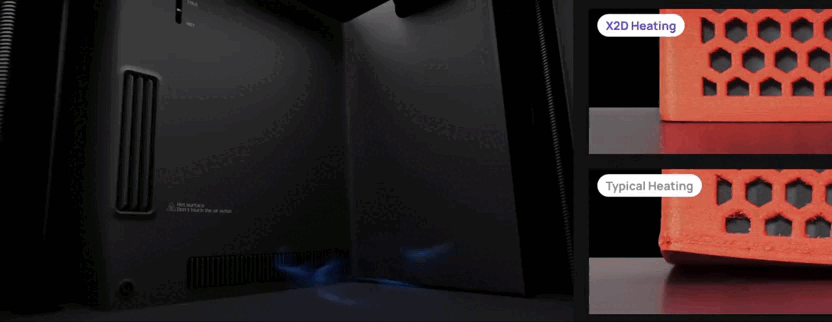 - Трёхступенчатая система фильтрации: G3-предфильтр, H12-HEPA и угольный фильтр. Благодаря этому X2D соответствует стандарту UL 2904 и безопасен для использования в помещении при печати PLA и PETG.