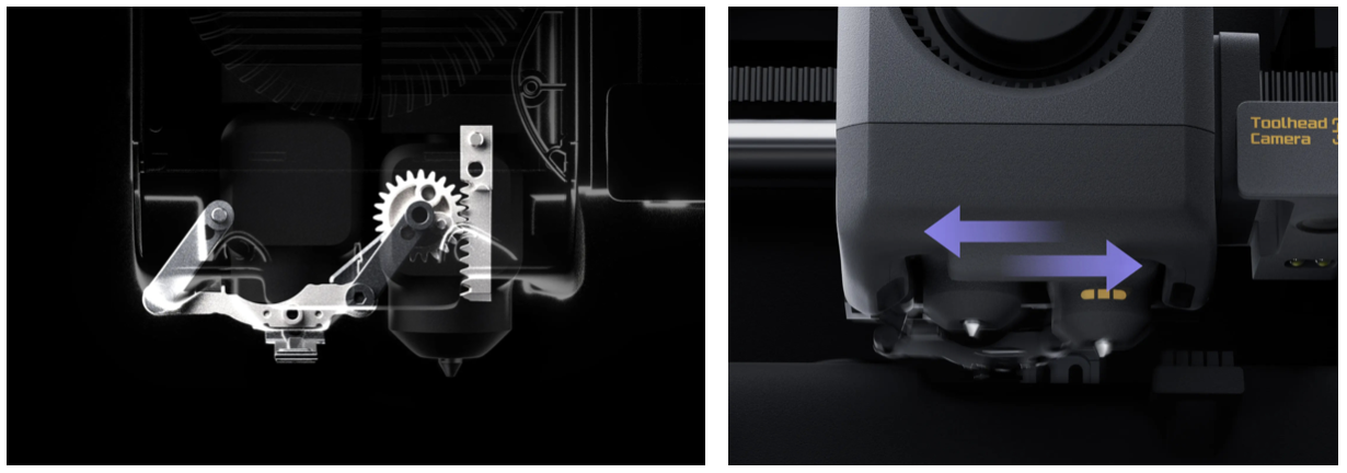 Переключение между соплами в Bambu Lab X2D реализовано через механическую систему по принципу «нажал — переключил — готово» (Tap. Switch. Done.). В отличие от традиционных решений с отдельными моторами, здесь используется встроенный механизм шестерён и триггеров: специальный рычаг в печатающей голове активирует триггер, который приводит в движение внутреннюю передачу и выполняет смену сопла.
