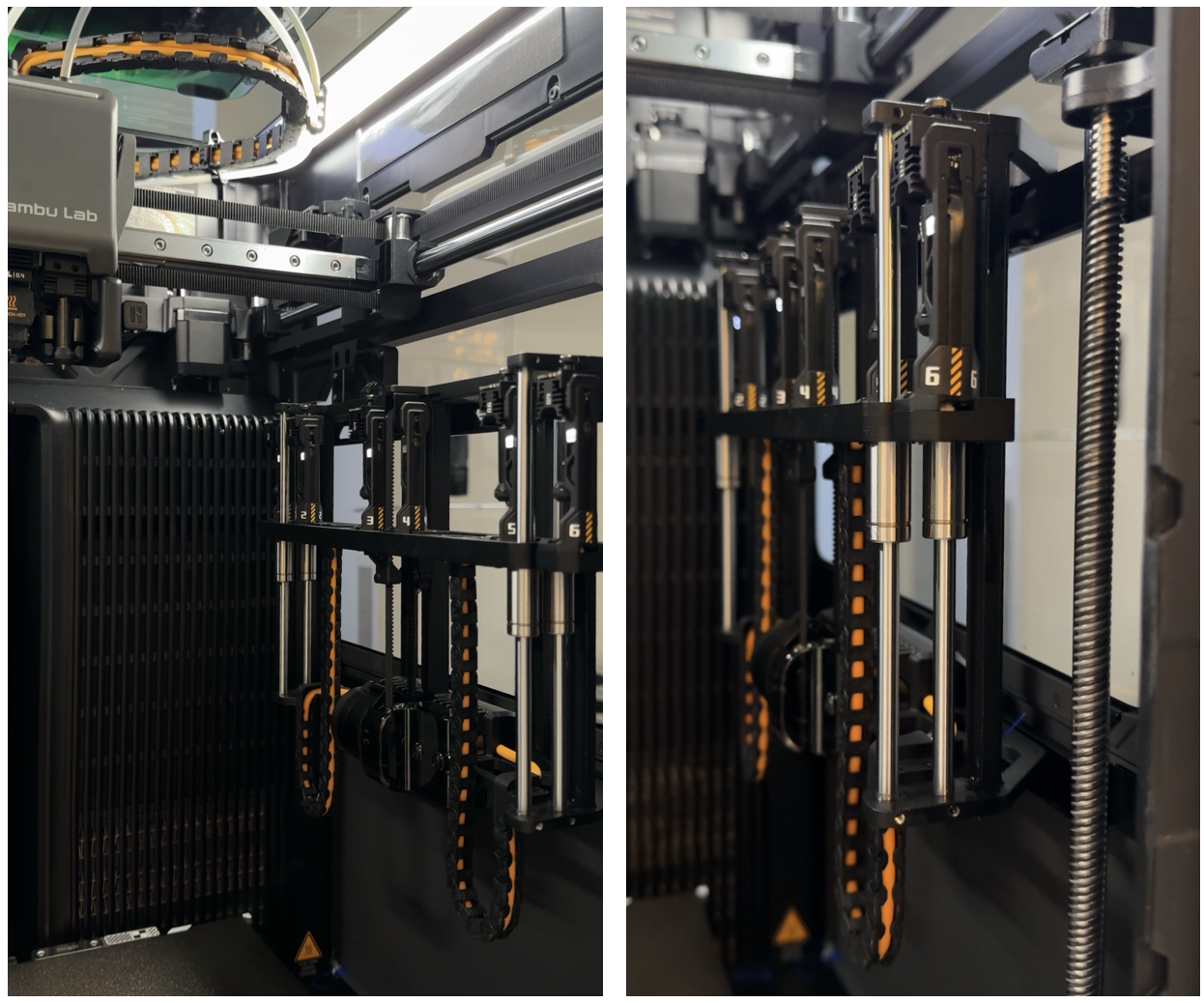 - Вместо замены целой головы принтера, H2C переключает сопла: правая часть экструдера может автоматически менять до шести сопел.