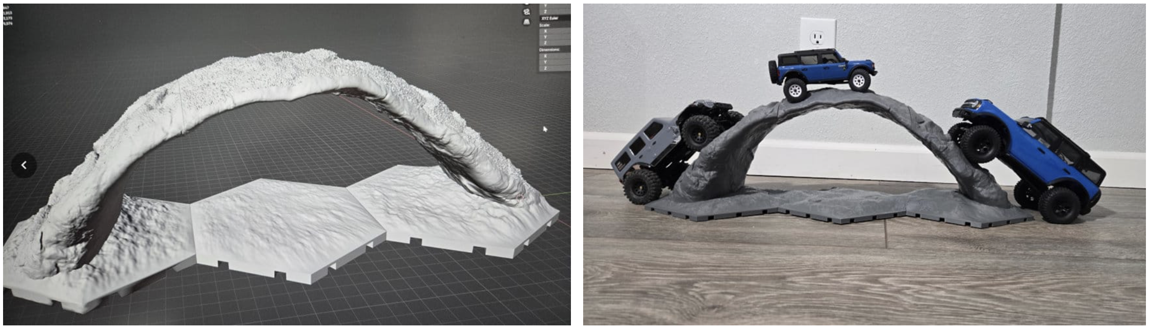 Модель трассы для внедорожных радиоуправляемых машин, разработанная на компьютере (слева), и результат реальной печати с тестированием (справа).