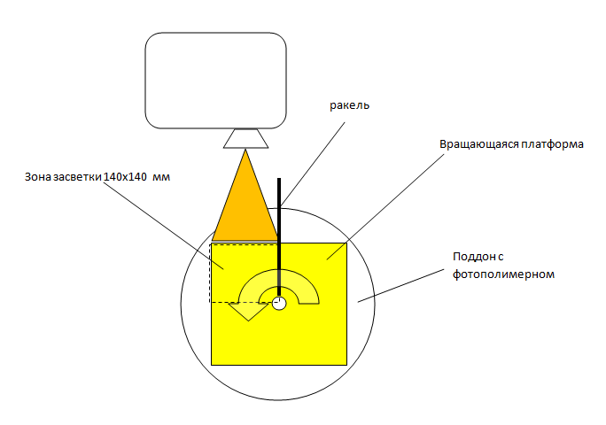 Принцип прост как автомат Калашникова - внутри цилиндрического поддона с фотополимером вращается платформа, где каждые 90 градусов вращения есть постановка на засветку следующей части рабочего поля общим размером 140Х140мм(7ммХ4 квадрат).