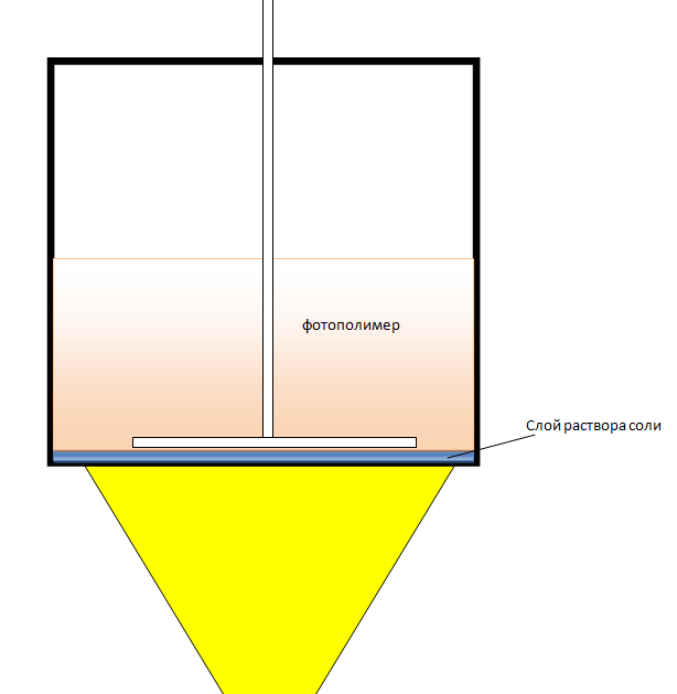 Поразмыслив пришел к выводу что не застывший фотополимер и мудренную пленку может прекрасно заменить технология экономичного заполнения ванны соленым раствором в системах up to down (сверху вниз)разделительной жидкостью между дном и активной зоной здесь выступает не не застывший фотополимер а соленый раствор концентрированный, он жидкий и будет прекрасно пропускать новые порции фотополимера под платформу при этом оставаясь на дне ванны (плотность больше).