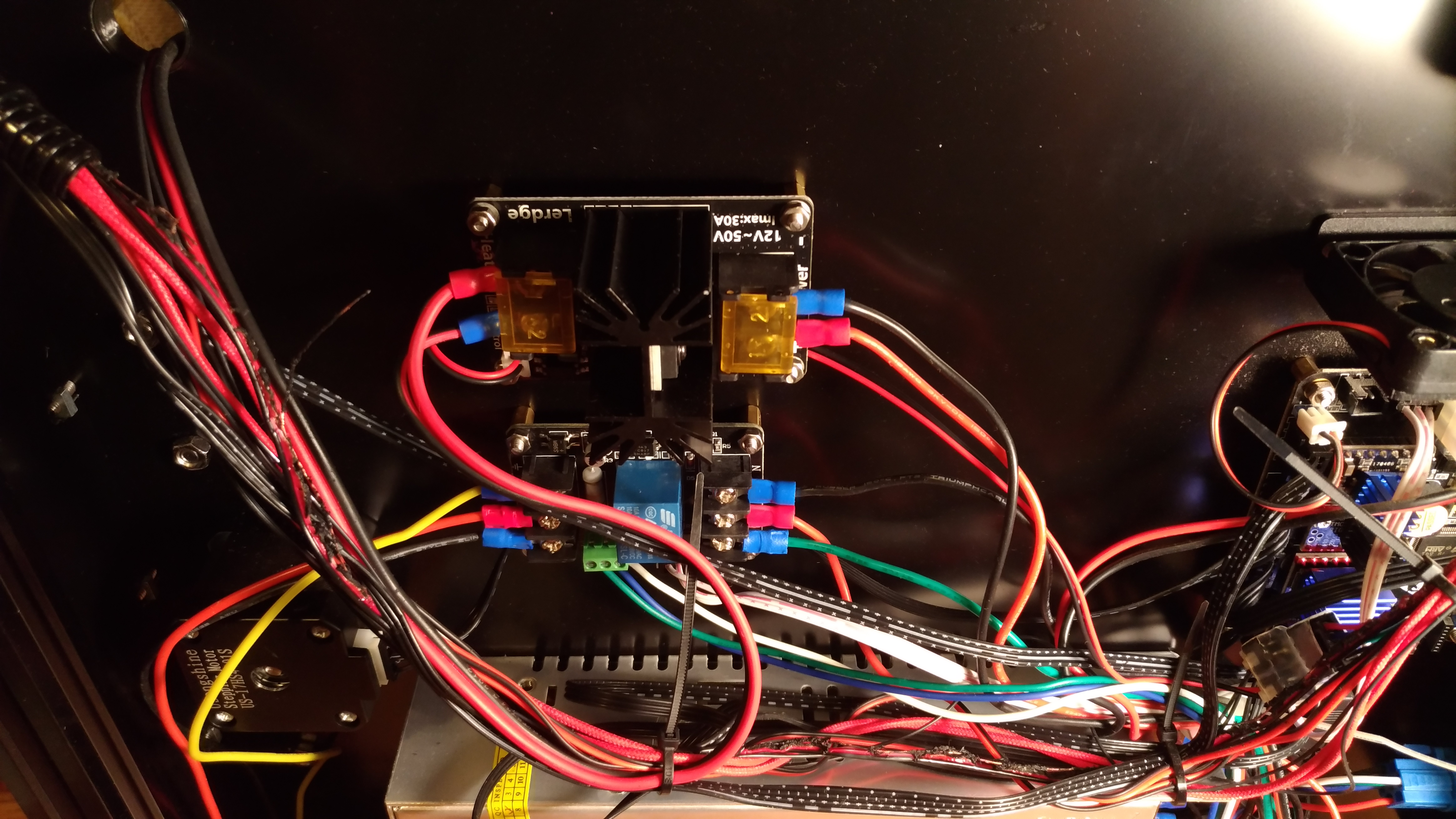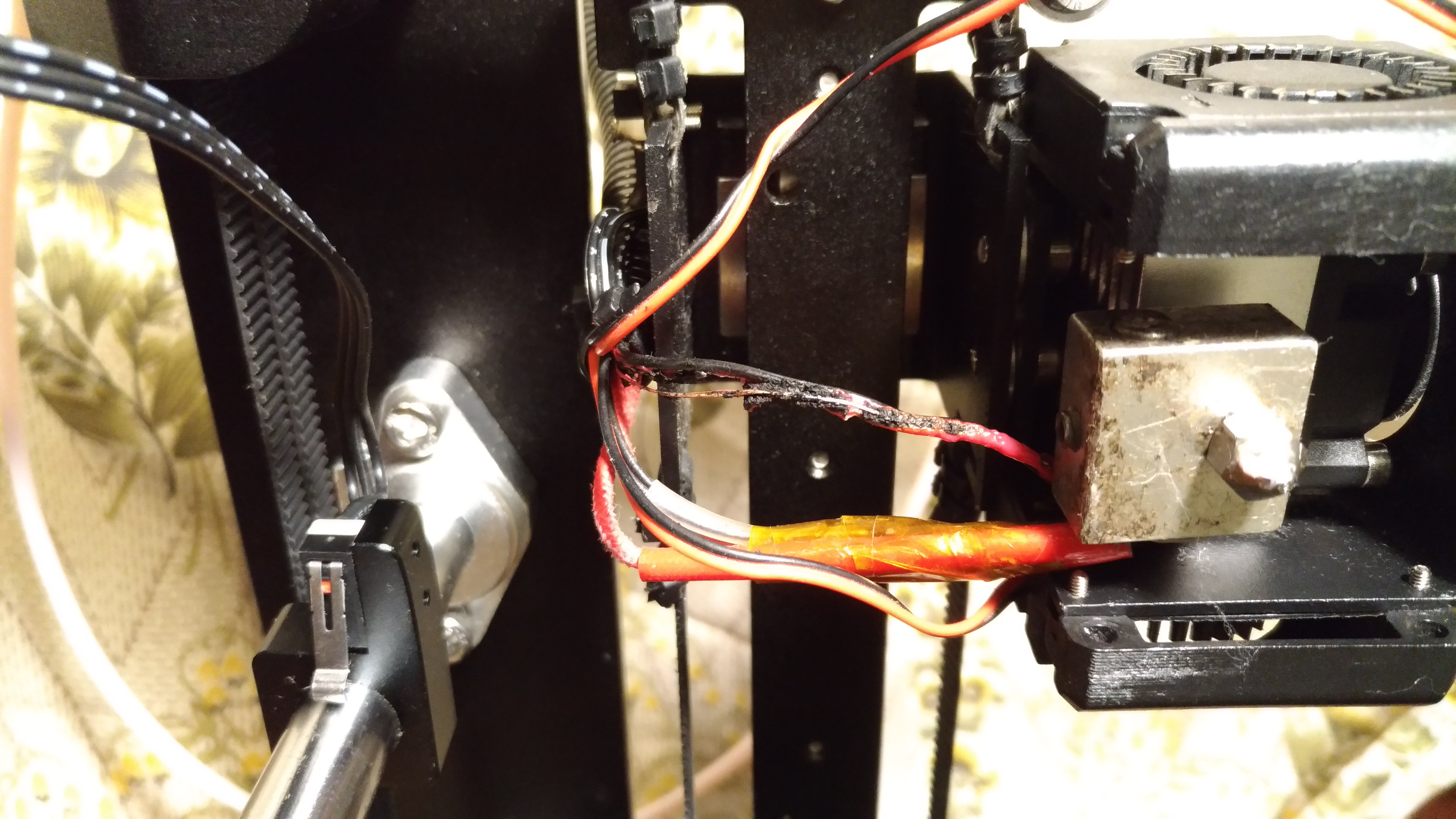 В общем, как я догадываюсь, после замены сопла и монтажа хотэнда я не посмотрел что и как там с проводами. Видать провод вентилятора радиатора касался нагревательного блока? Ну, я еще при первой сборке принтера заметил что тут как то все ненадежно и может случиться, что провода изоляцией будут касаться горячих деталей. И подумалось мне что надо там какую то теплоизоляцию проводов сделать... Но только подумалось...)))