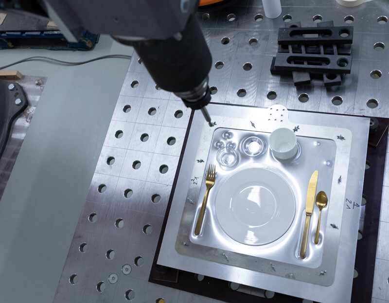 Проектировщица Николь Хюбшер (Nicole Hübscher) разработала поднос для еды, используя технологию поточечной инкрементальной формовки. Робот постепенно изменяет форму листа алюминия с помощью давления без нагревания материала. Поскольку изменяется не только пластичность, но и эластичность металла, 3D-сканер Creaform ACADEMIA использовался для сравнения целевой CAD-модели с фактическим результатом. Такой подход позволяет сразу устранить неточности на производстве.