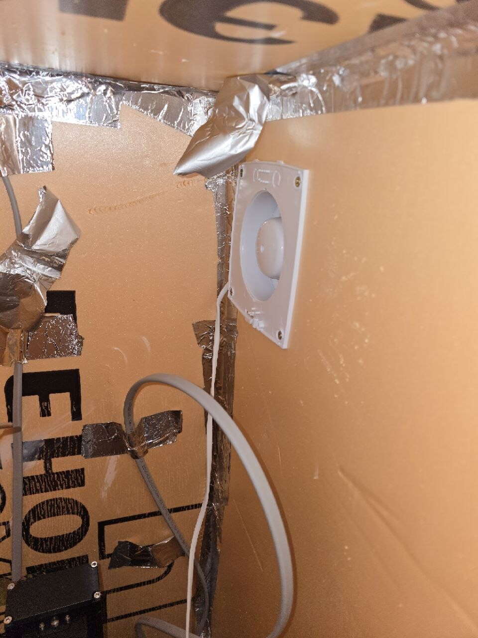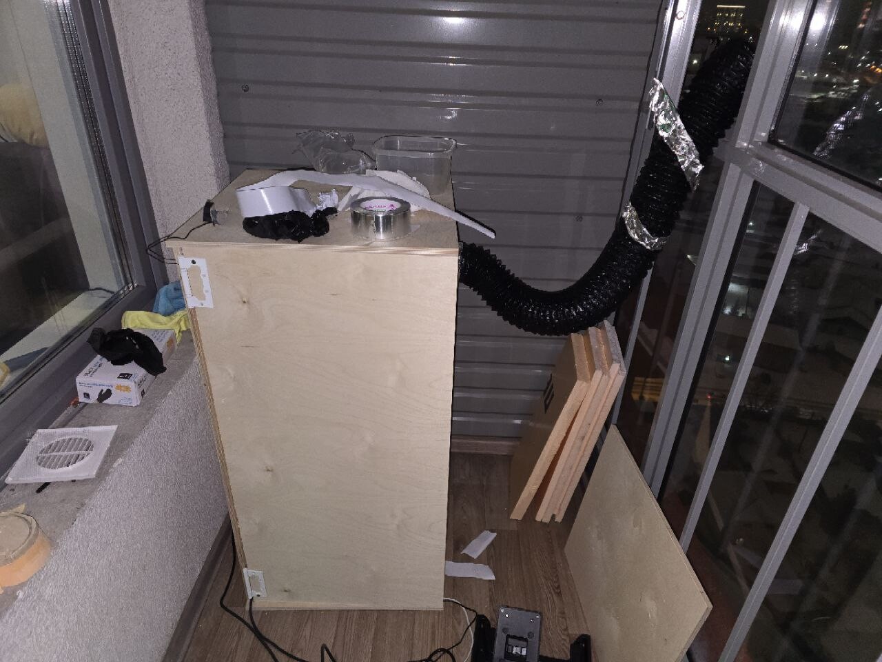Короче попробовал собрать коробку для того, чтобы пары не попадали в квартиру.