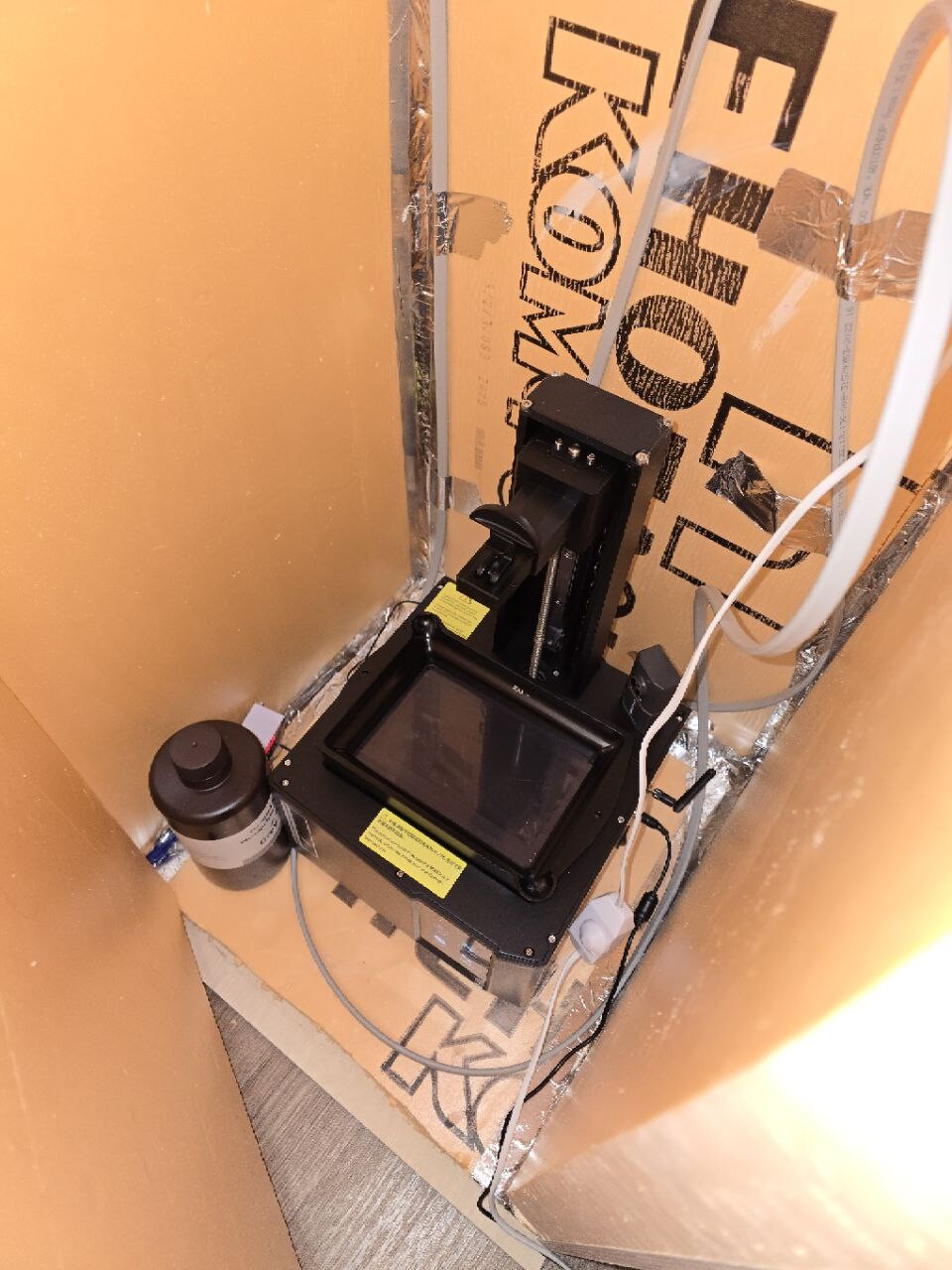 В целом все конечно максимально криво-косо внутри. Держится на алюминиевом скотче и честном слове. Но это прототип проверить концепцию, будет ок печататься или нет. Печать работает, я доволен. Теперь осталось красиво все оформить, чтобы было самому удобно и приятно внутрь заглядывать. Возможно герметиком проклеить углы, поставить короб на какой-нибудь стол, чтобы было рабочее место и можно радоваться красивым миниатюрам