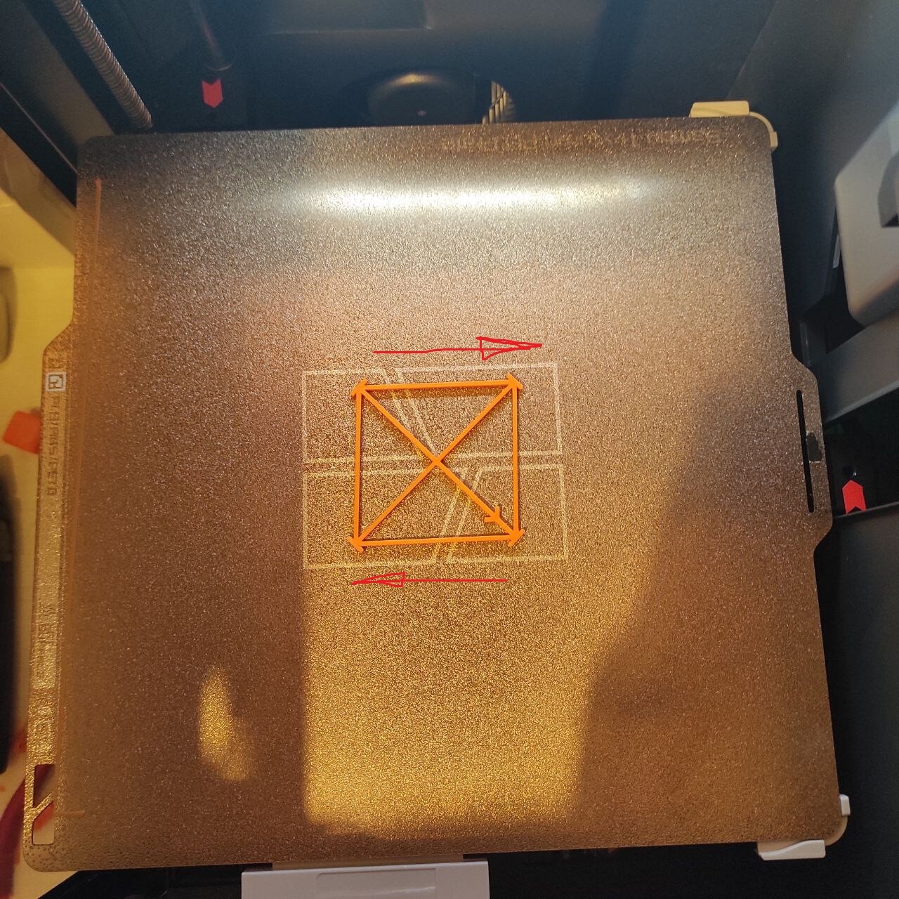 Думаю, что понятно, что я сделал. Также выполнил первую печать, вторую, а потом вернулся к стандартному профилю без корректирующей строчки. После нескольких печатей запустил тестовый квадрат. Перекоса нет от слова совсем. Правда техническая линия идет не совсем параллельно столу. Где-то на 1 миллиметр. Но для меня это уже не проблема.