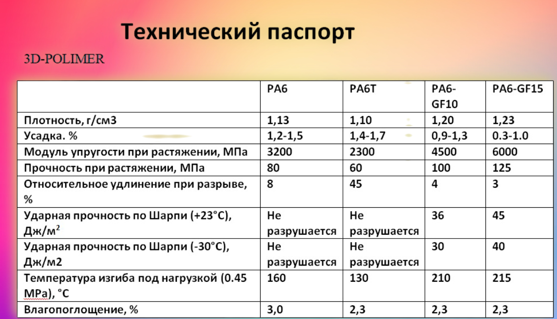 - PA6 Т: прогрев хотэнда до 290-310°С, прогрев столика до 100-110°С. Усадка варьируется в пределах 1,4-1,7%.