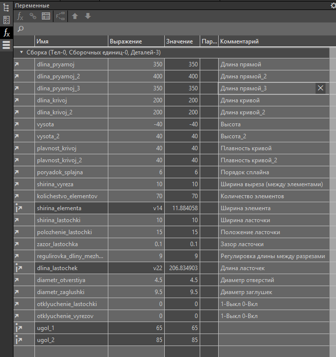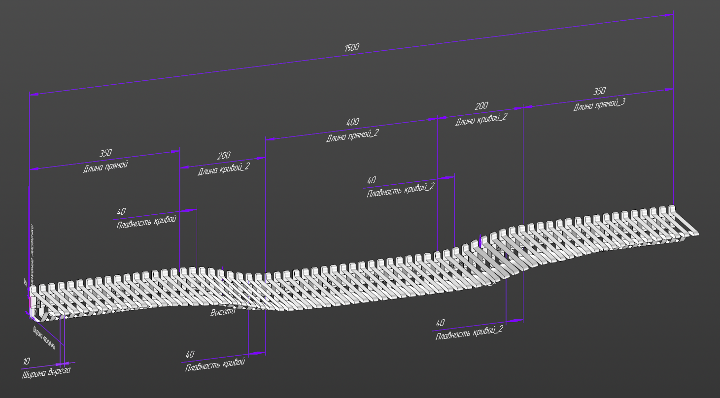 Модель выполнена с использованием зависимостей и формул, обеспечивающих автоматическую перестройку геометрии при изменении входных данных. Это позволяет легко настраивать полку под индивидуальные требования. Крепление "элементов" полки осуществляется с помощью соединения «ласточкин хвост»