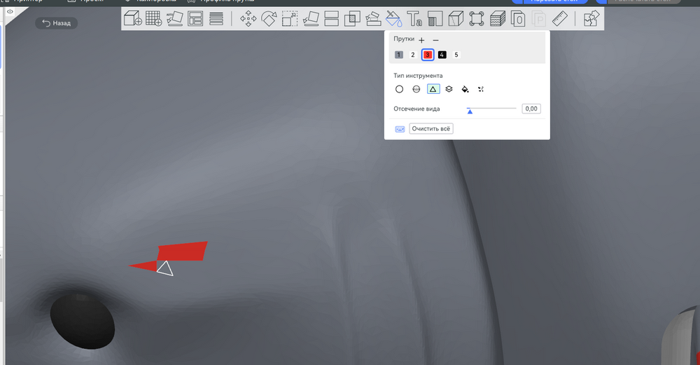 • Режим «Треугольник» — для самых тонких работ. Способен закрасить детали по мельчайшим составляющим STL-модели — треугольникам. Я туда даже не лез, для моих задач вообще не нужно.