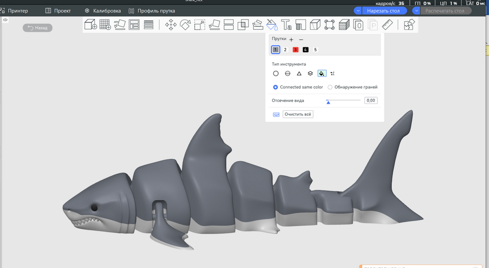На самом деле, всё просто. Но в сложных цветных моделях требуется аккуратность. Для примера взял модель акулы. Эта модель подготовлена для цветной печати, поэтому все части, которые могут быть покрашены - выполнены как отдельные тела, которые легко залить нужным цветом.