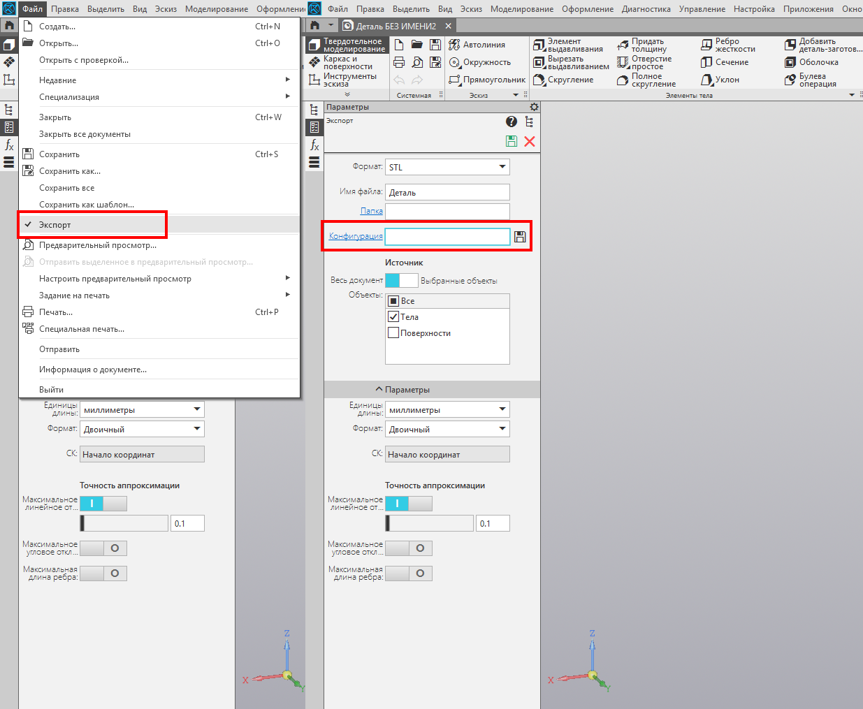 Для сохранения в Stl другими настройками используется команда меню Файл-Экспорт. В команде можно настроить параметры экспорта.