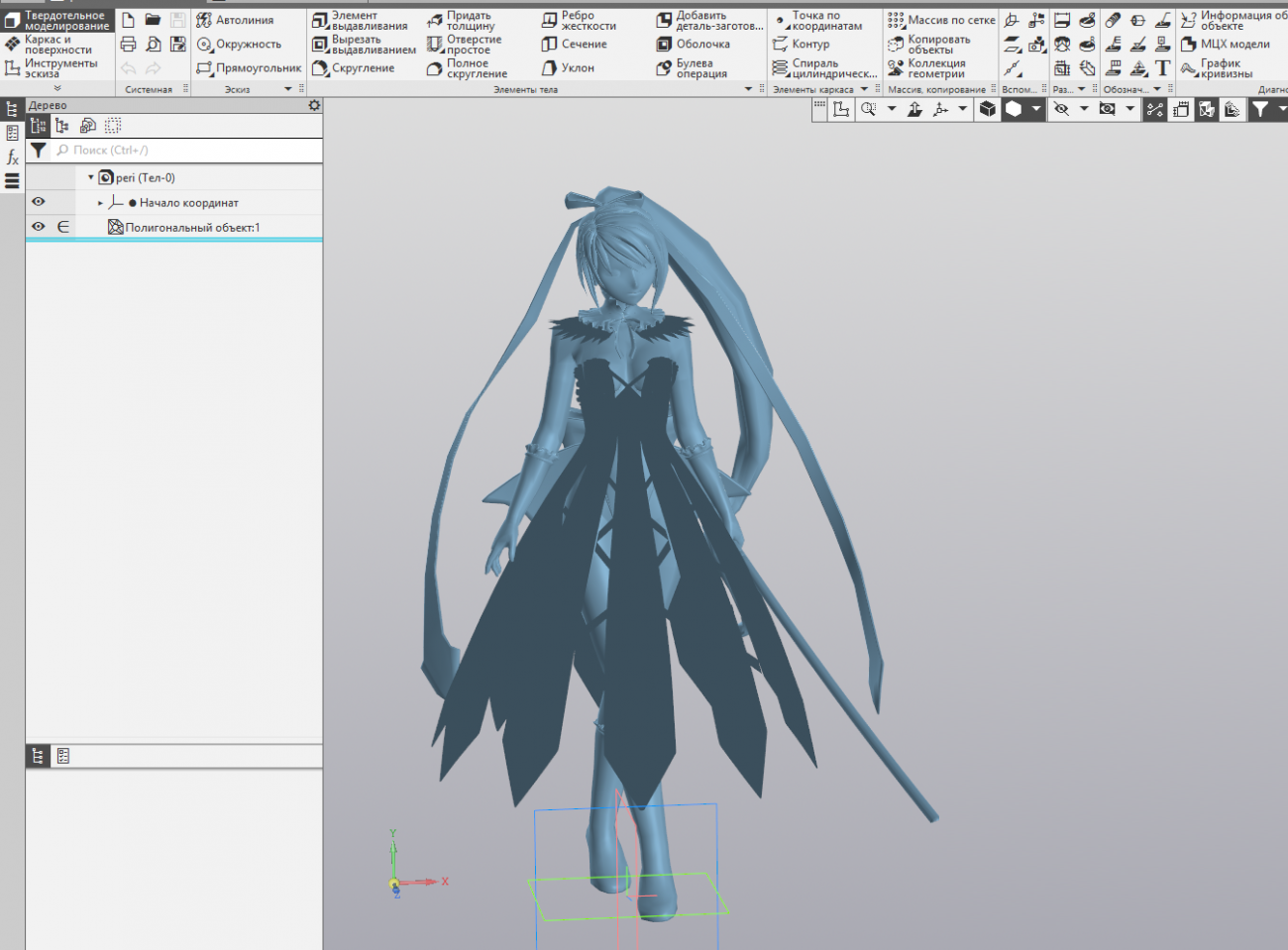 - Моделирование в САПР редактируемой 3D-геометрии изделия с деревом построения на основе полигонального объекта.