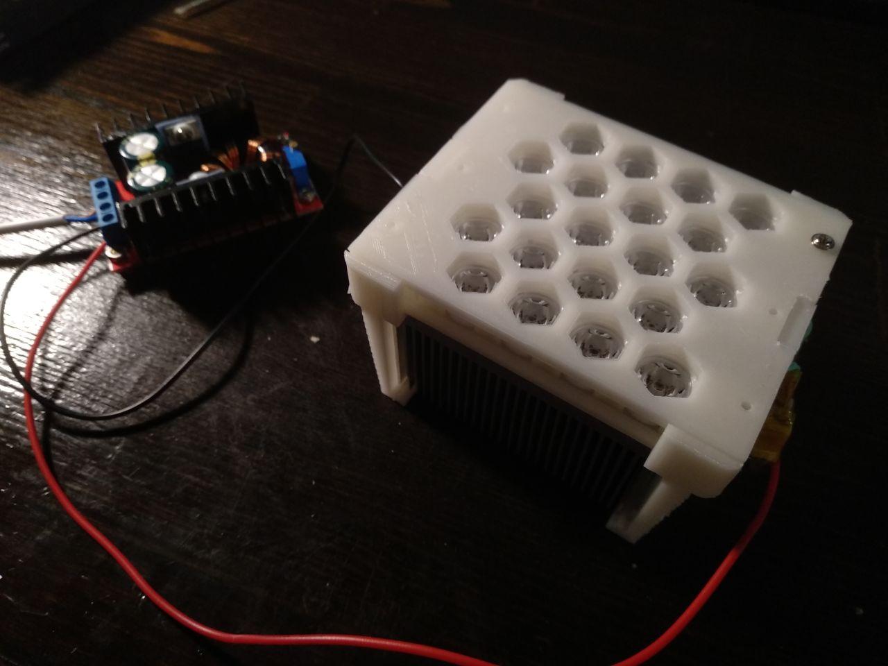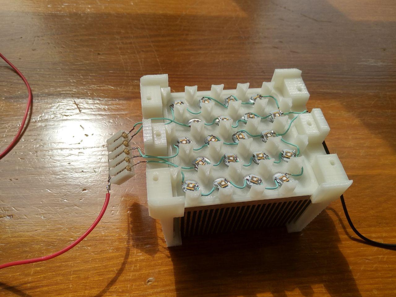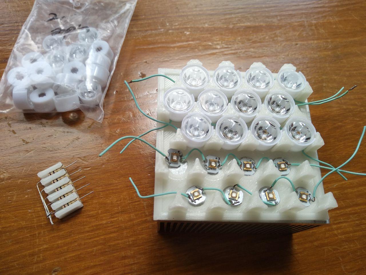 3 Распечатка пайка сборка. линзы оказались разной прозрачности подбирал на глаз. в пайке я не спец, но спаял. распечатка ПЛА пластиком. под диодами термопаста.