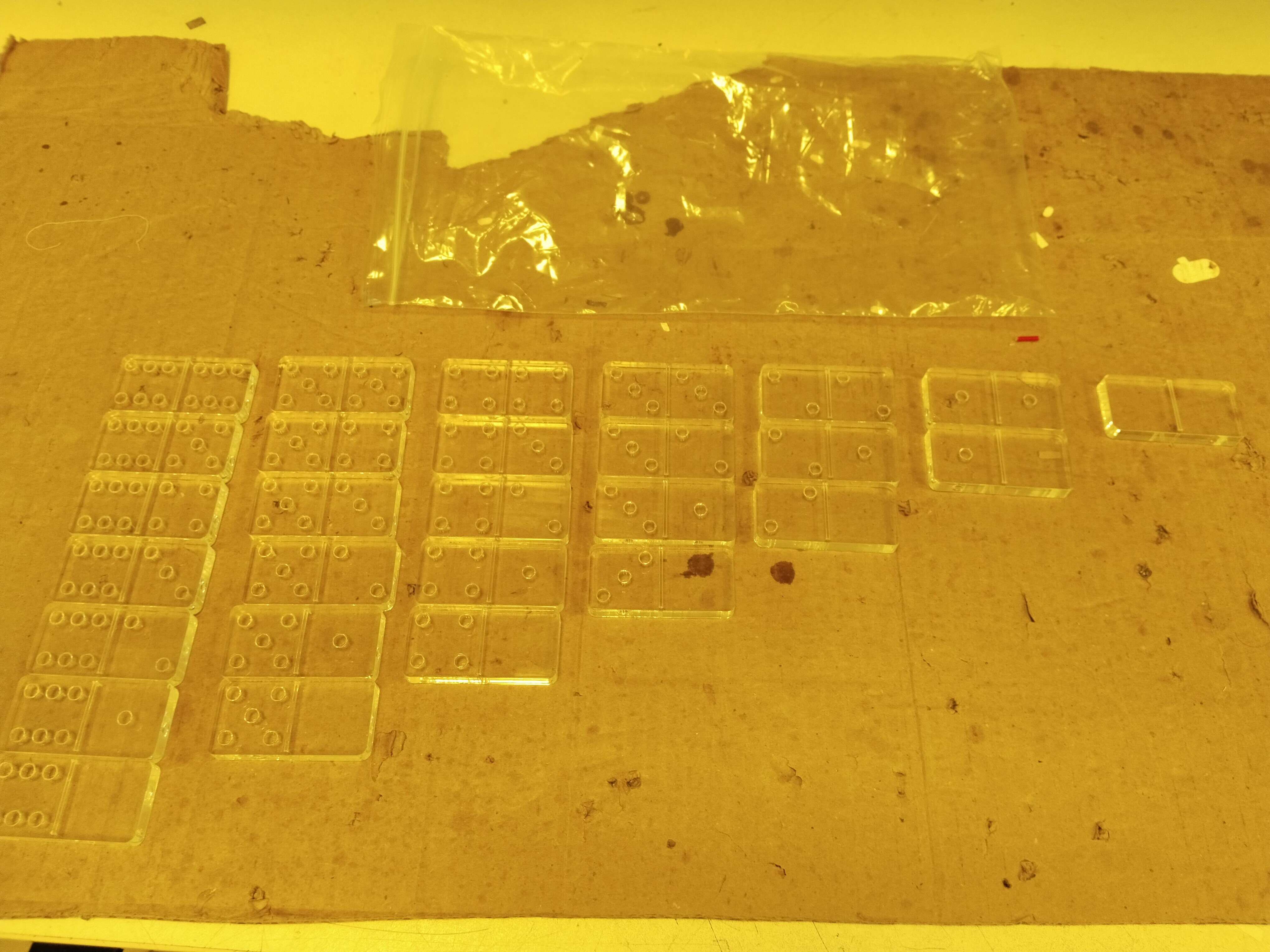 На досуге решил сделать кости домино , чтобы время скоротать. Сначала идея была распечатать их на принтере смолой , дабы были прозрачными. Затем лаком или краской нанести на места для точек (из я просто просверлил на 3 мм примерно). Все это можно было сделать на принтере , но подвернулась возможность сделать на лазерном станке. И вот результат . Размеры здесь немного больше (оператор проявил креативный подход - сделал для себя по крупнее костяшки)