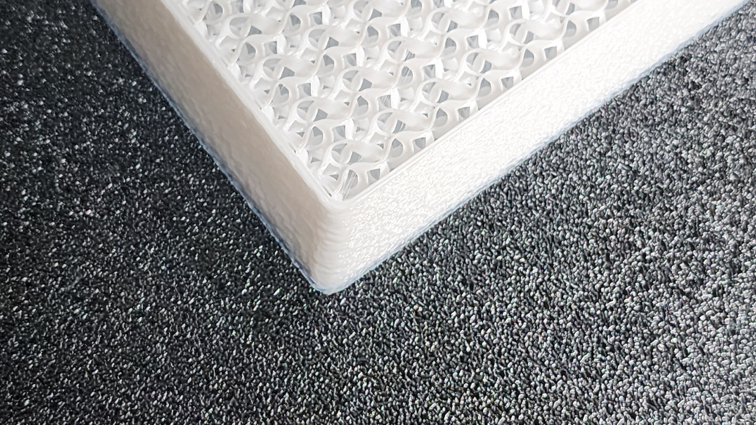 Пример печати с нечеткой оболочкой (для выравнивания слоёв поверхности). Заполнение "гироид" на скорости делает весьма прилично. TPU в таком режиме начинает "пружинить", можно делать эластичные вставки. Да, с эластичными материалами особых проблем нет - TPU печатается на стоковом профиле.