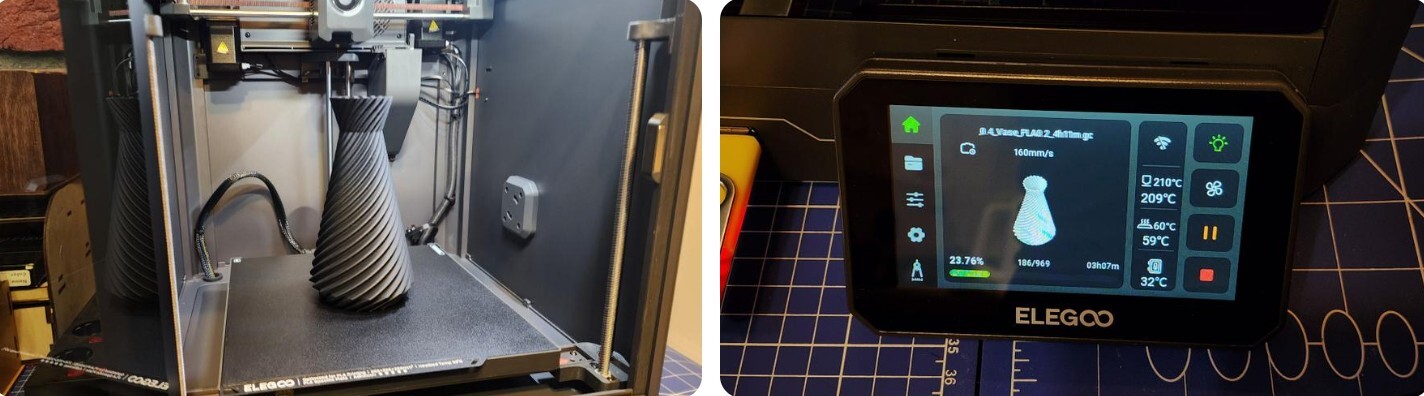 Небольшой отчет о моём 3D принтере Centauri Carbon от Elegoo. Пользуюсь практически год — брал в начале 2025. Благо цена Elegoo CС весьма приятная (около 30 тыс, на распродаже можно даже было взять дешевле). Полностью закрытая камера (есть контроль температуры камеры) позволяет печатать инженерными пластиками. В базе PEI пластина с магнитной фиксацией и двумя текстурированными сторонами. Установлен аналог Klippera, для работы используется мод OrcaSlicer от Elegoo. Скорости печати простыми пластиками до 500 мм/с. Ну и удаленный доступ с камерой.