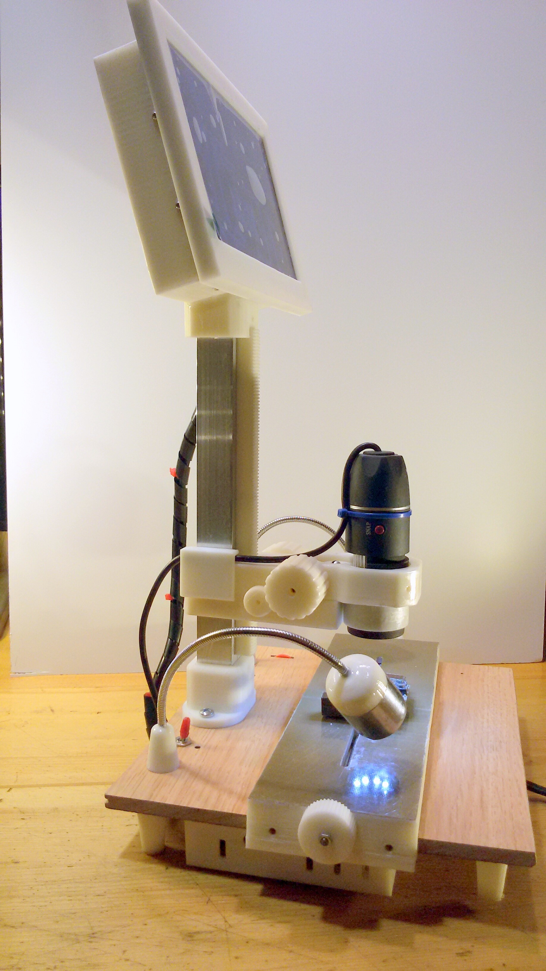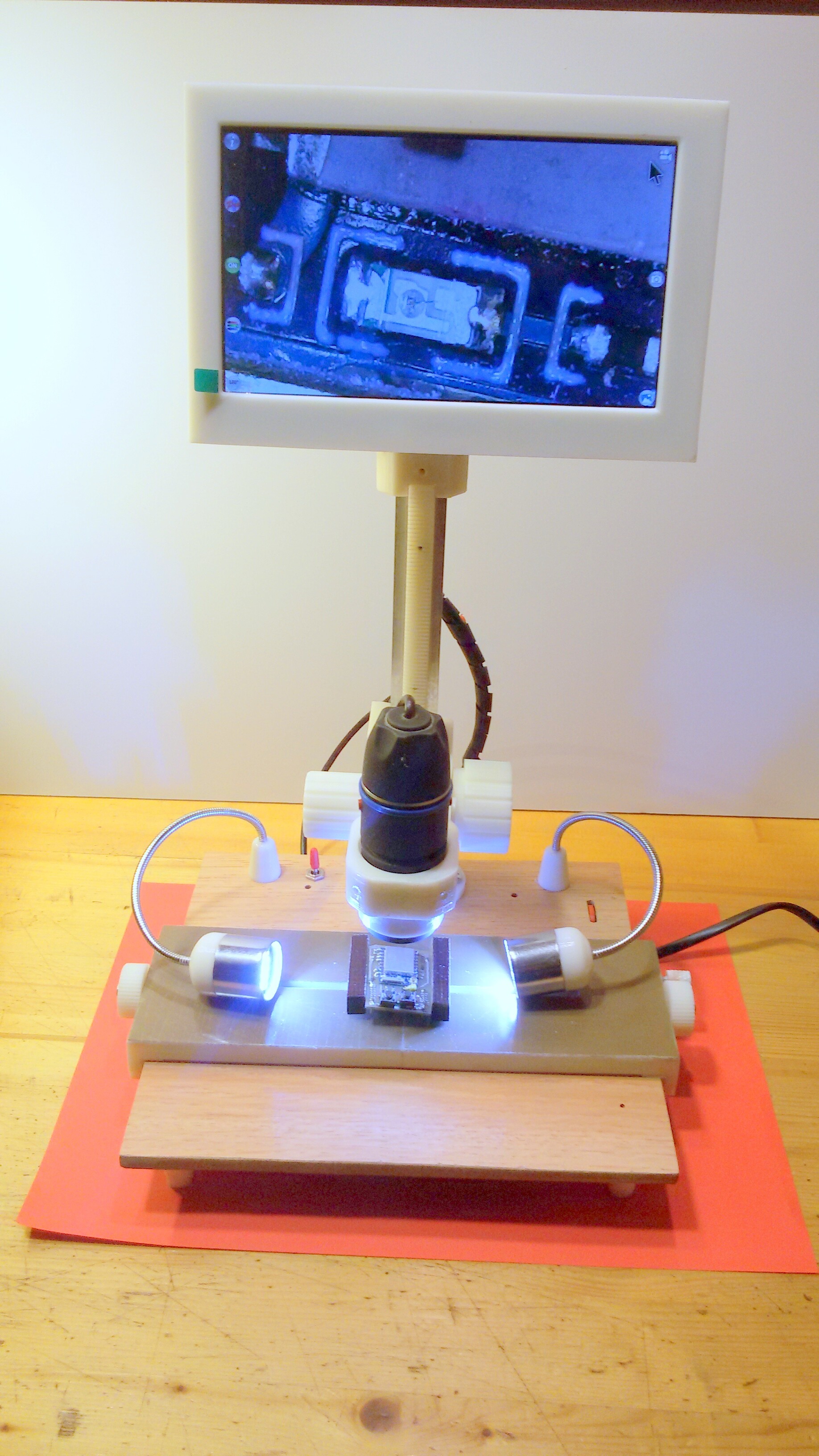 Предложили мне ТV BOX-X96 за 300рублей. Я сперва подумал, продавец в цене ошибся, а как вновь услышал цену, тут же и купил, не раздумывая! И вот, держу его в руках и после радости от взятого задешево и подумалось: «А нафига он мне нужен, когда все телевизоры в доме «смарт». И даж чуток обидно сделалось за хоть и дешевую, но совсем ненужную покупку.Полистал я настройки боксовы, интернет-ютуб глянул и увидел иконку видеокамеры. Вот тут меня и осенило. Сам китай usb микроскоп три года пылился на хлипком штативе, с которым только и мучится.Кароч, получилось микроскоп мне забесплатно вышел. А вот 7дюймовый дисплей пришлось у китайца взять за деньги. За небольшие. В общем, полновесный микроскоп мне обошелся вместе с удовольствием его создать его, всего за 2 тыщи русских рублей. Нарисовал во Фрикаде детальки, да и собрал. В общем, если у кого ТV BOX без дела валяется, очень рекомендую из него микроскоп сваять. В электронике нынешней, где без SMD компонентов не обойтись, порой он нужным бывает.