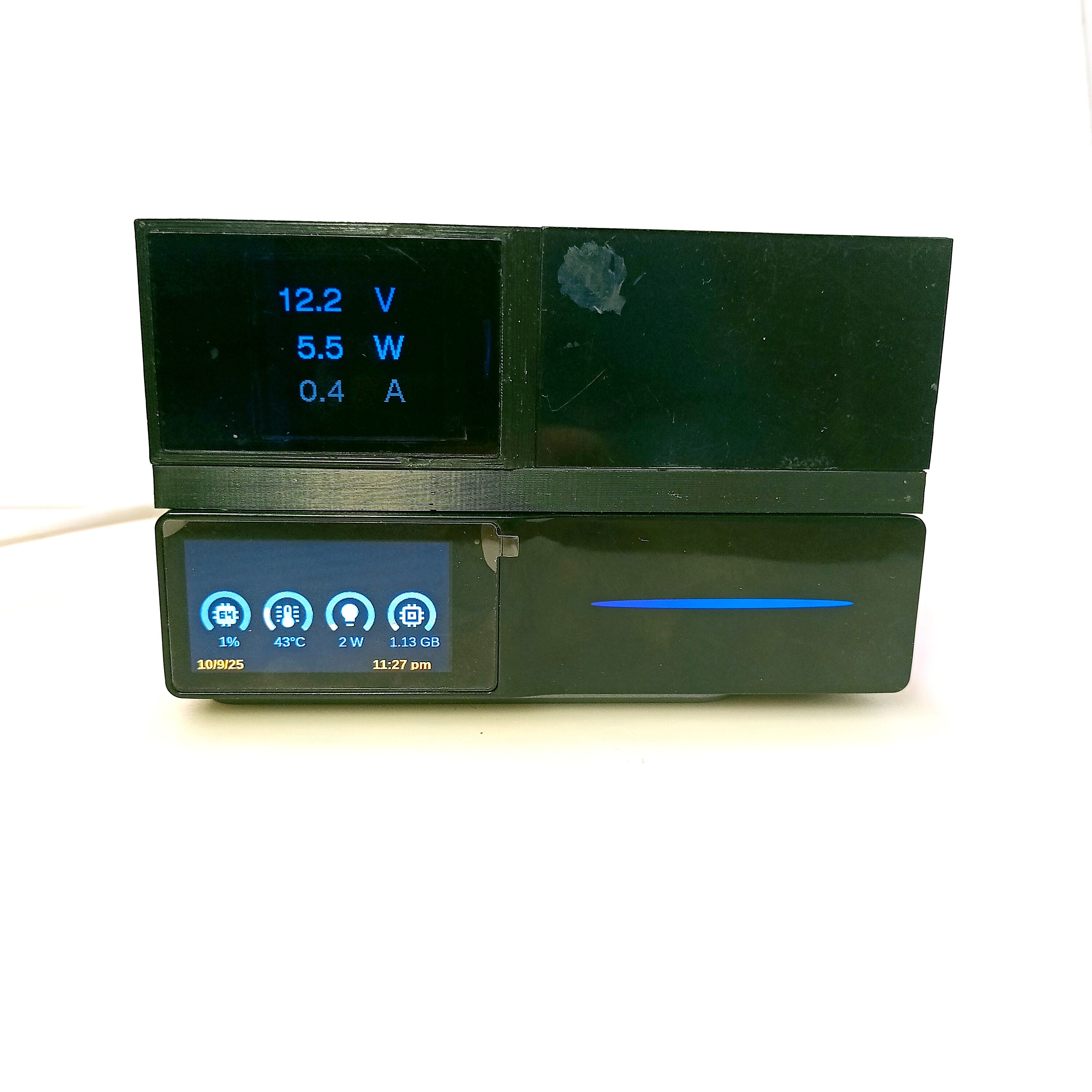 Наличие дисплея у миника требовало, какой-никакой дисплей и к фейсу блоку питания, что и воплотил в виде ампер вольт ватт метра. Прикольно видеть аппетиты мини ПК. Да и веселее с двумя-то.