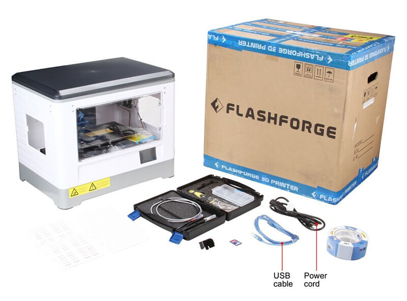 Dreamer одна из наиболее популярных FDM моделей в линейке 3D принтеров компании FlashForge (Китай). Полностью закрытый корпус устройства позволяет печатать пластиками, чувствительными к перепадам температур. Устройство имеет стильный внешний вид, приковывает взгляды и выглядит весьма интересно: видно, что дизайнеры постарались на славу. Принтер поставляется в собранном виде и после распаковки практически сразу готов к эксплуатации. Помимо самого принтера, в комплект поставки входят две катушки пластика, сменные покрытия для стола, набор инструментов, USB кабель и SD карта. Согласитесь, довольно внушительный набор полезностей.
