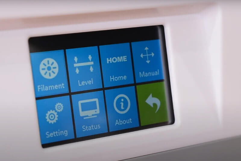 3D принтер Dreamer собран достаточно надёжно с применением качественных материалов, что можно уже увидеть при визуальном знакомстве. Давайте изучим его более детально. На передней панели расположен цветной сенсорный дисплей (3,5 дюйма). Он даёт возможность полноценного управления функциями и настройками принтера: вы сможете отправить модель на печать из памяти принтера или SD карты; управлять температурой обоих экструдеров, а также температурой стола; загрузить и выгрузить пластик, запустить процедуру выравнивания. Наличие дисплея делает данный принтер, пожалуй, одним из самых удобных в управлении, по сравнению с конкурентами и после эксплуатации FlashForge Dreamer, чувствуется нехватка дисплея при работе с другими моделями.