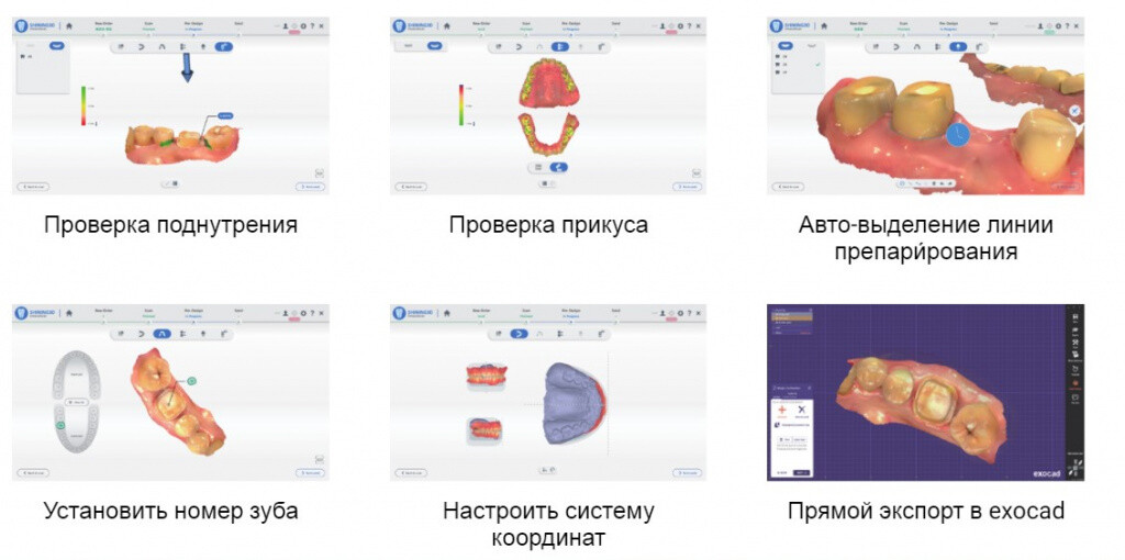 Shining 3D предлагает своим пользователям набор клинических инструментов, которые помогают стоматологам предварительно обработать полученные данные и оценить результаты. Врач может определить линию прикуса, пронумеровать зубы, настроить систему координат и экспортировать данные в программу для стоматологов Exocad.