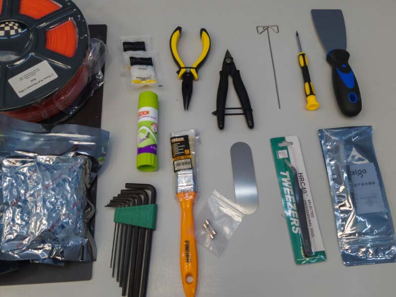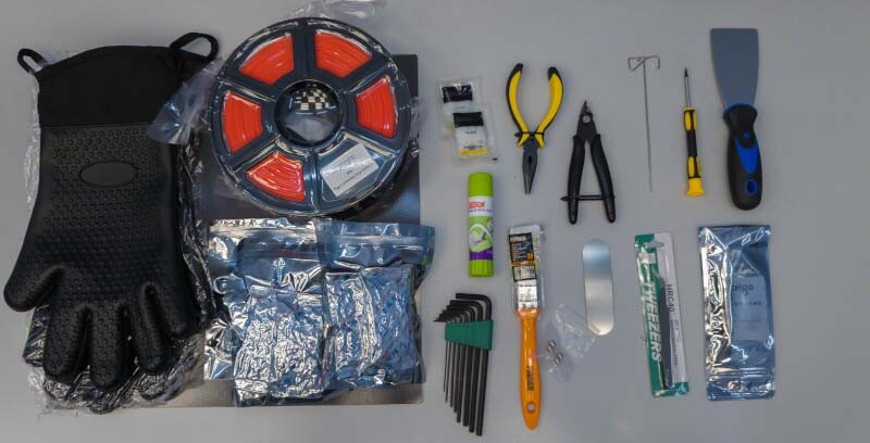 Кроме всех необходимых инструментов, вроде шестигранных ключей, шпателя, иглы для прочистки сопла, в комплекте также имеются отличные защитные перчатки, катушка PLA пластика и несколько пакетиков с силикагелем, который предполагается класть в отсек для катушки с филаментом, для того, чтобы сушить пластик.