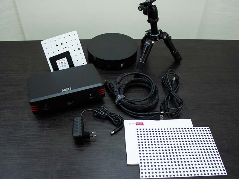 Устройство полностью попадает под определение “plug and play” - то есть, достали из коробки, подключили, запустили программу и можете сканировать. Neo очень компактный 3D сканер, камеры для захвата цветных текстур спрятаны в основной проекционный модуль, так что никаких дополнительных конструкций как в профессиональном Spectrum нет. Отличный настольный штатив, поворотный стол и вот ваше рабочее место готово.