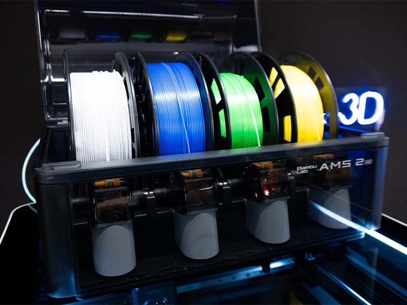 Теперь что касается AMS 2 Pro - система автоматической подачи материалов от Bambu значительно прокачалась, вместе с запуском H2D вышла AMS 2, а теперь и Pro версия.
