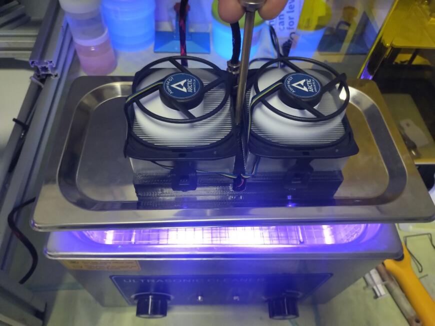 Логичное решение проблемы -- использовать ультразвуковую ванну с подогревом для всех этапов постобработки принтов (отмывка, отпуск, дозасветка), тем самым разгрузить рабочее пространство от лишних приборов и минимизировать затраты на проектирование и сборку. Все, что нужно, это встроить свет в крышку УЗ ванны. Ради экономии за основу системы были взяты две не самые дорогие 400нм УФ матрицы с али. Охлаждение простыми процессорными кулерами. Монтируется все на печатную раму. Матрицы защищены от паров воды дешевой УФ-прозрачной FEP пленкой от Anycubic и запитаны от LED драйвера на неполную мощность, 130 Вт вполне хватает для дозасветки любых принтов за полчаса. Вентиляторы запитал отдельным БП, а вводы и выводы источников питания объединил в совместные разъемы. Напряжение драйвера при имеющихся токах превышает 60 В, поэтому городить схему для вентиляторов не стал, подходящие DC-DC модули весьма габаритные. При использовании одной матрицы подошел бы миниатюрный модуль DSN2596 или аналог.