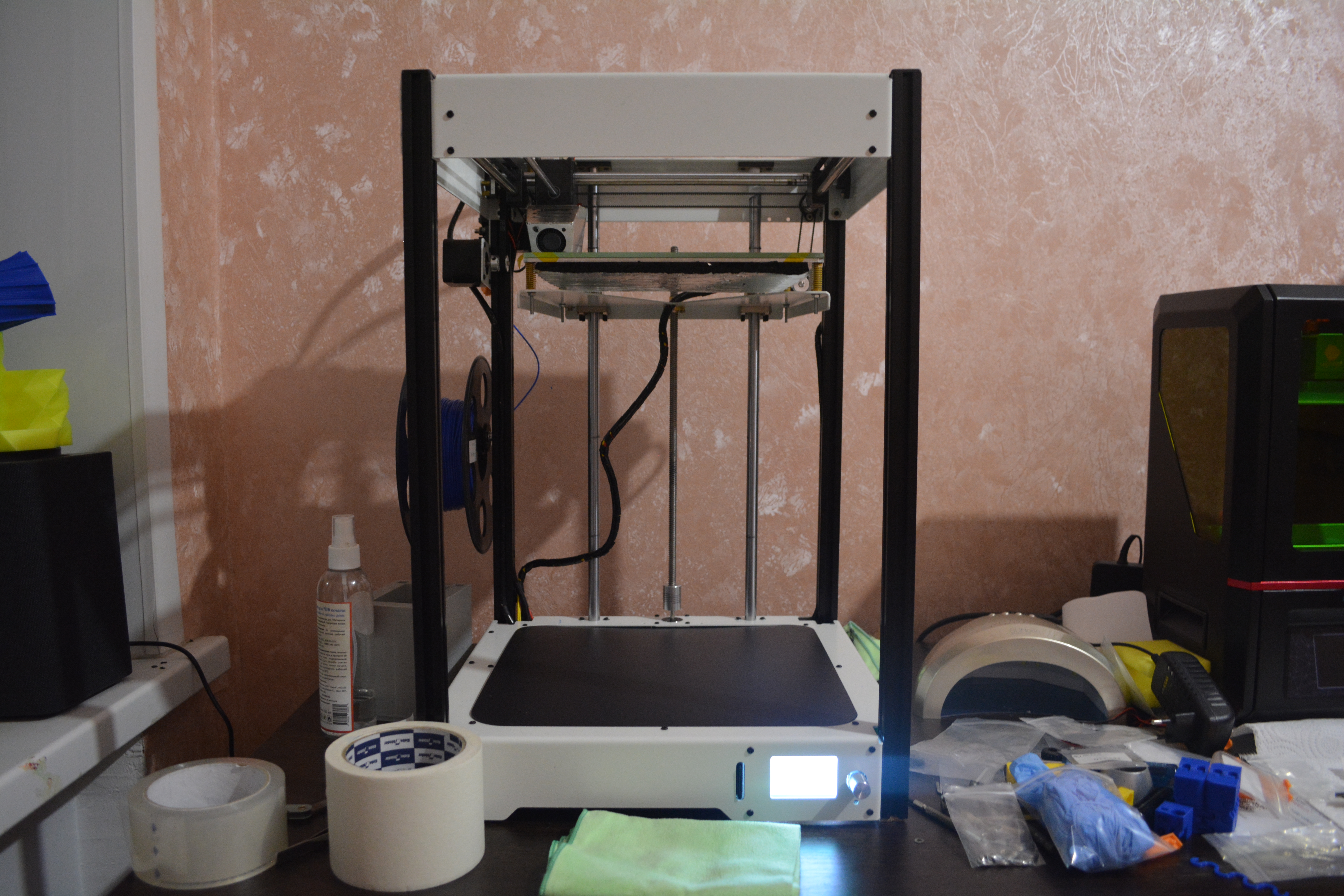 По комплектации хотелось бы сказать что в комплекте нет даже самой плохой бомженаклейки на стол, так что если захотите приобрести этот аппарат заранее озаботьтесь о поверхности для печати, если вы конечно не печатаете прямо на алюминиевом столе. И пластик для печати так же приобретите, его тоже не положили. Конкретно в моем случае это не проблема - пластик есть, а зеркало нарезать быстро.