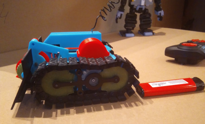 - три электродвигателя. Два ходовых электродвигателя и редукторы - самодельные. Изготовлены из игрушек неизвестного происхождения. Трансмиссия гусеничная. Вращающий момент т от двигателя на гусеницы передается через пластиковые шестерни. Гусеницы от детского конструктора. Электрический двигатель на "разрушителе" от CDROM с передачей через резиновый ремень - канцелярская резинка. Оружие в общем то, в целях безопасности , бутафорское, ну или почти бутафорское.