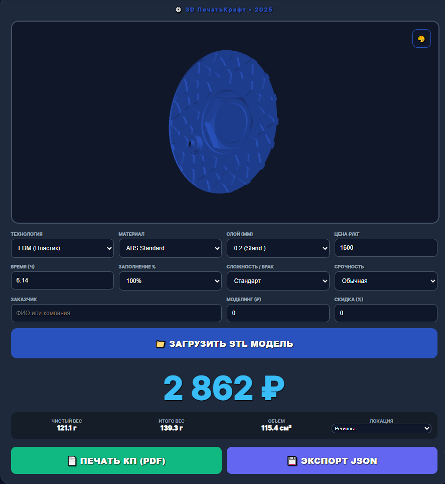 Считает время, а не только граммы: Главная фишка — привязка цены к высоте слоя. Если клиент хочет слой 0.05 мм, калькулятор автоматически поймет, что принтер будет занят в 4 раза дольше, и честно пересчитает стоимость рабочего времени.