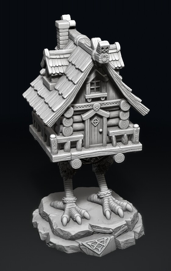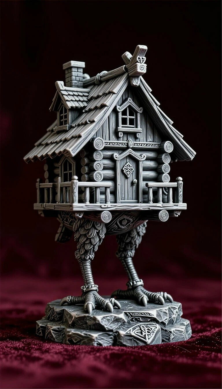 Я использовал промпт: "студийное макрофото, цветные печатные элементы модели, цветная миниатюра, цветная 3d печать, элементы из графита, серебристая патина графита, высокий контраст теней, сказочная детализированная избушка на курьих ножках в полоборота, боевая стойка, причудливые ювелирные узоры, мускулатура, рубленые края монументальность, стоит на камне, гипердетализация, постобработка, покраска, высокий контраст, на темно-красном бархате, детализация морды"