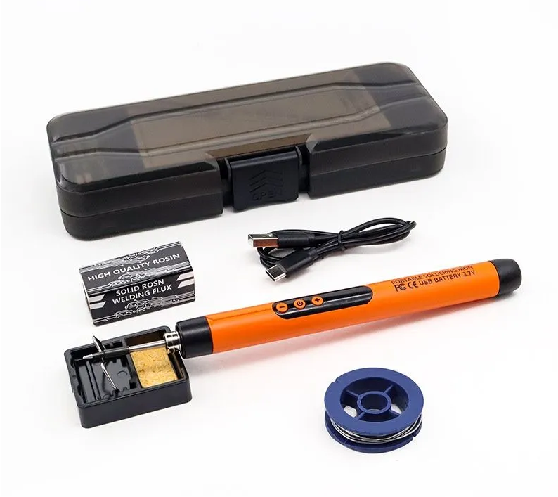 Некоторое время назад был куплен аккумуляторный паяльник, продавался он в кейсе, с наполнением, припой, канифоль, дополнительные жала, провод для зарядки и подставка.