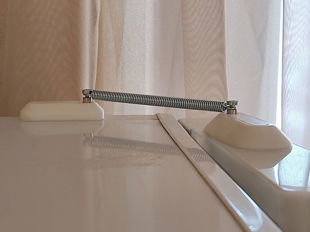 Расположение оказалось удачным, т.к. при максимальном открытии, пружина уходила за пределы шарнира, тем самым не было необходимости искать третью руку для её удержания, если обе руки заняты к примеру кастрюлей.
